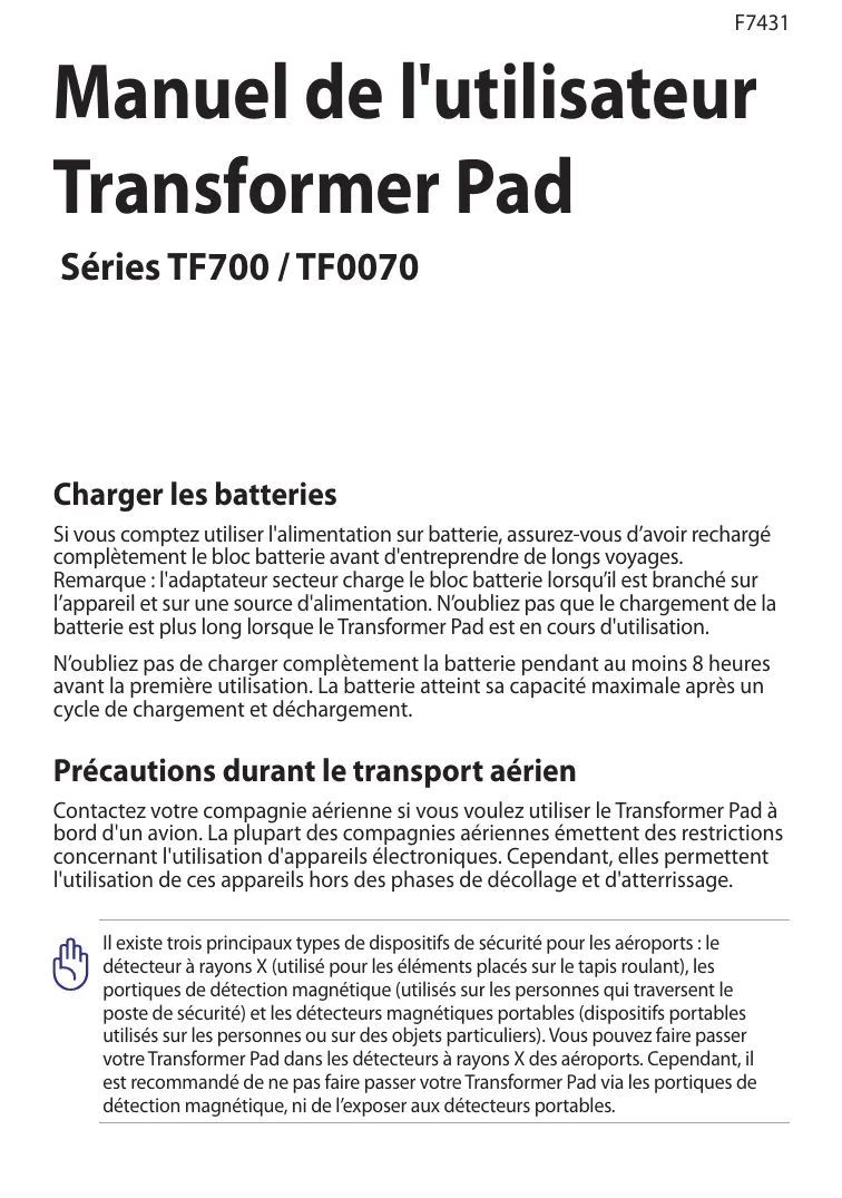 Contactez votre compagnie aérienne si vous voulez utiliser le Transformer Pad à bord d'un avion. La plupart des compagnies aériennes émettent des restrictions concernant l'utilisation d'appareils électroniques. Cependant, elles permettent l'utilisation de ces appareils hors des phases de décollage et d'atterrissage. Il existe trois principaux types de dispositifs de sécurité pour les aéroports : le détecteur à rayons X (utilisé pour les éléments placés sur le tapis roulant), les portiques de détection magnétique (utilisés sur les personnes qui traversent le poste de sécurité) et les détecteurs magnétiques portables (dispositifs portables utilisés sur les personnes ou sur des objets particuliers). Vous pouvez faire passer votre Transformer Pad dans les détecteurs à rayons X des aéroports. Cependant, il est recommandé de ne pas faire passer votre Transformer Pad via les portiques de détection magnétique, ni de l’exposer aux détecteurs portables.