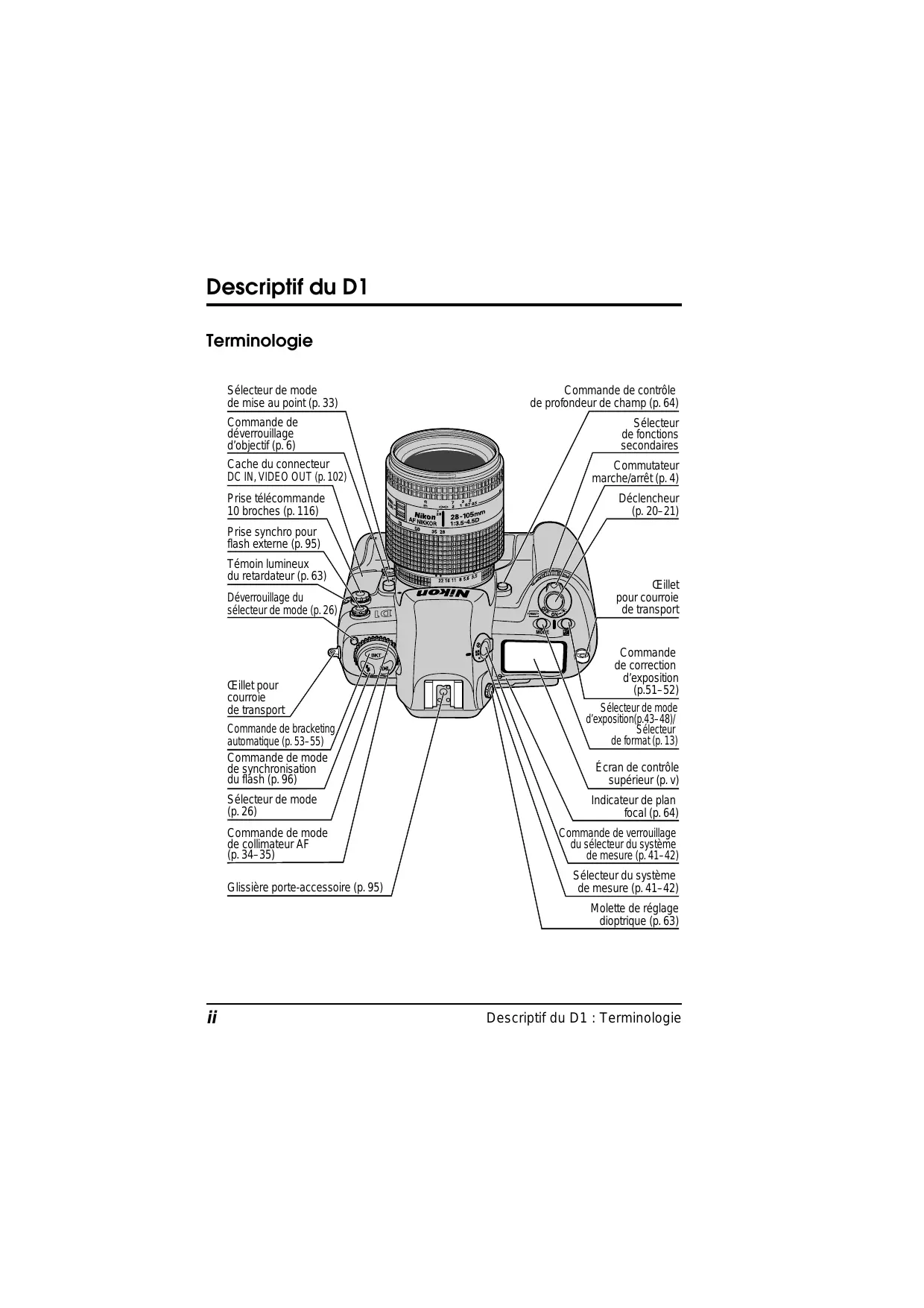 Descriptif du D1 Terminologie Sélecteur de mode de mise au point (p. 33) Commande de déverrouillage d’objectif (p. 6) Cache du connecteur DC IN, VIDEO OUT (p. 102) Prise télécommande 10 broches (p. 116) Commande de contrôle de profondeur de champ (p. 64) Sélecteur de fonctions secondaires Commutateur marche/arrêt (p. 4) Déclencheur (p. 20–21) Prise synchro pour flash externe (p. 95) Témoin lumineux du retardateur (p. 63) Déverrouillage du sélecteur de mode (p. 26) Œillet pour courroie de transport Commande de bracketing automatique (p. 53–55) Commande de mode de synchronisation du flash (p. 96) Sélecteur de mode (p. 26) Commande de mode de collimateur AF (p. 34–35) Glissière porte-accessoire (p. 95) Œillet pour courroie de transport Commande de correction d’exposition (p.51–52) Sélecteur de mode d’exposition(p.43–48)/ Sélecteur de format (p. 13) Écran de contrôle supérieur (p. v) Indicateur de plan focal (p. 64) Commande de verrouillage du sélecteur du système de mesure (p. 41–42) Sélecteur du système de mesure (p. 41–42) Molette de réglage dioptrique (p. 63)