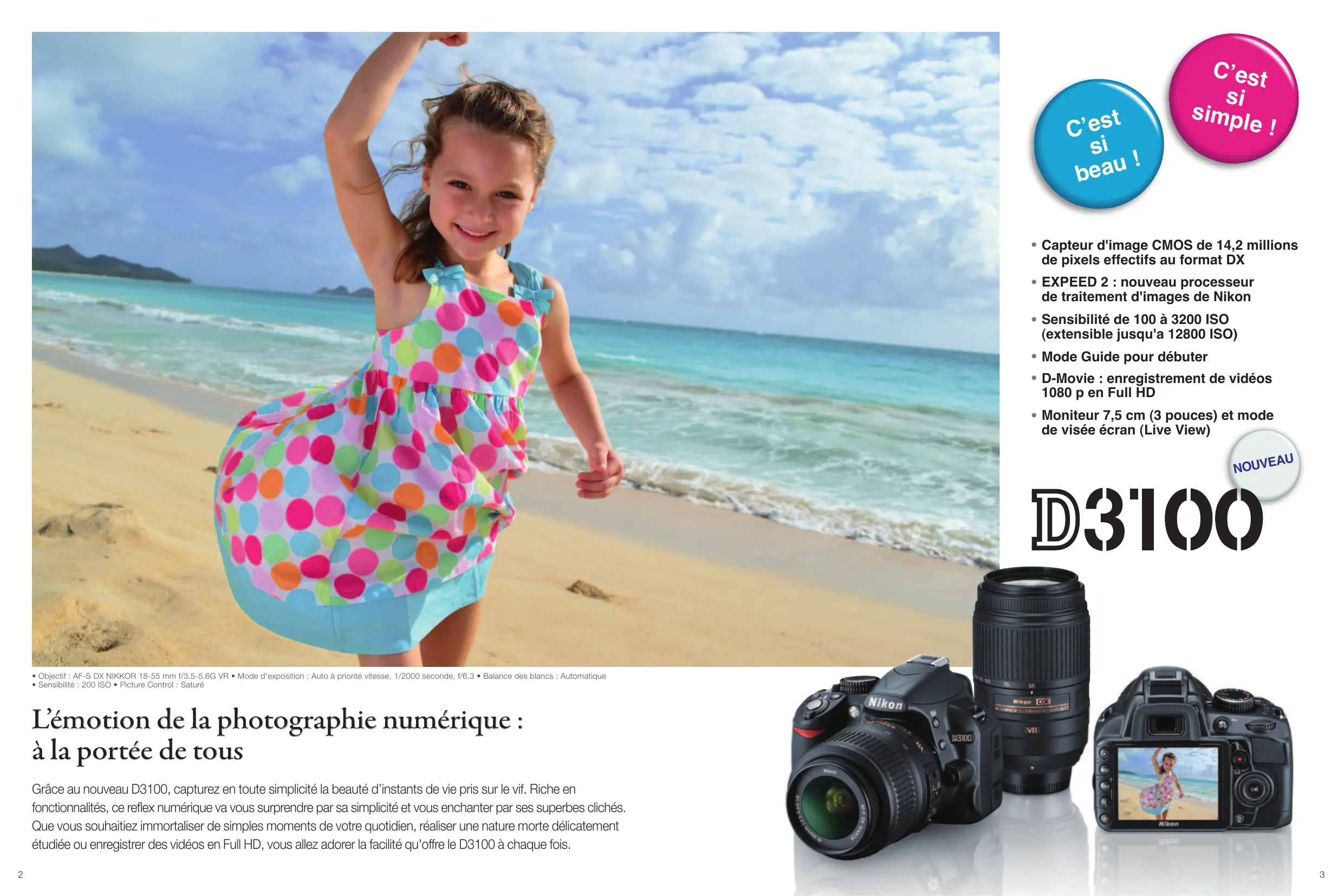 Grâce au nouveau D3100, capturez en toute simplicité la beauté d'instants de vie pris sur le vif. Riche en