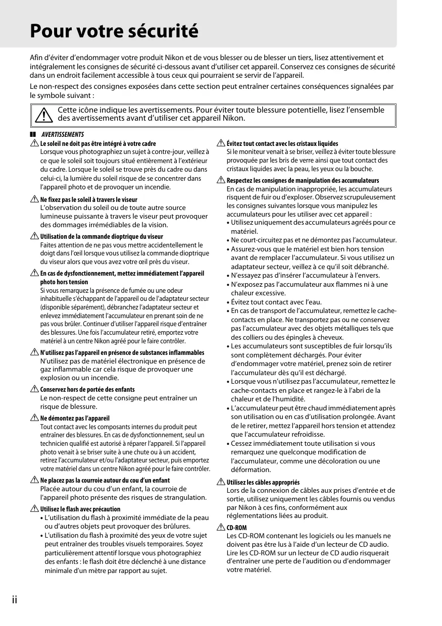 Pour votre sécurité Afin d’éviter d’endommager votre produit Nikon et de vous blesser ou de blesser un tiers, lisez attentivement et intégralement les consignes de sécurité ci-dessous avant d’utiliser cet appareil. Conservez ces consignes de sécurité dans un endroit facilement accessible à tous ceux qui pourraient se servir de l’appareil. Le non-respect des consignes exposées dans cette section peut entraîner certaines conséquences signalées par le symbole suivant : icône indique les avertissements. Pour éviter toute blessure potentielle, lisez l’ensemble des avertissements avant d’utiliser cet appareil Nikon. A Cette ❚❚ AVERTISSEMENTS A Le soleil ne doit pas être intégré à votre cadre Lorsque vous photographiez un sujet à contre-jour, veillez à ce que le soleil soit toujours situé entièrement à l’extérieur du cadre. Lorsque le soleil se trouve près du cadre ou dans celui-ci, la lumière du soleil risque de se concentrer dans l’appareil photo et de provoquer un incendie. A Ne fixez pas le soleil à travers le viseur L’observation du soleil ou de toute autre source lumineuse puissante à travers le viseur peut provoquer des dommages irrémédiables de la vision. A Utilisation de la commande dioptrique du viseur Faites attention de ne pas vous mettre accidentellement le doigt dans l’œil lorsque vous utilisez la commande dioptrique du viseur alors que vous avez votre œil près du viseur. A En cas de dysfonctionnement, mettez immédiatement l’appareil photo hors tension Si vous remarquez la présence de fumée ou une odeur inhabituelle s‘échappant de l’appareil ou de l’adaptateur secteur (disponible séparément), débranchez l’adaptateur secteur et enlevez immédiatement l’accumulateur en prenant soin de ne pas vous brûler. Continuer d’utiliser l’appareil risque d’entraîner des blessures. Une fois l’accumulateur retiré, emportez votre matériel à un centre Nikon agréé pour le faire contrôler. A N’utilisez pas l’appareil en présence de substances inflammables N’utilisez pas de matériel électronique en présence de gaz inflammable car cela risque de provoquer une explosion ou un incendie. A Conservez hors de portée des enfants Le non-respect de cette consigne peut entraîner un risque de blessure. A Ne démontez pas l’appareil Tout contact avec les composants internes du produit peut entraîner des blessures. En cas de dysfonctionnement, seul un technicien qualifié est autorisé à réparer l’appareil. Si l’appareil photo venait à se briser suite à une chute ou à un accident, retirez l’accumulateur et/ou l’adaptateur secteur, puis emportez votre matériel dans un centre Nikon agréé pour le faire contrôler. A Ne placez pas la courroie autour du cou d’un enfant Placée autour du cou d’un enfant, la courroie de l’appareil photo présente des risques de strangulation. A Utilisez le flash avec précaution