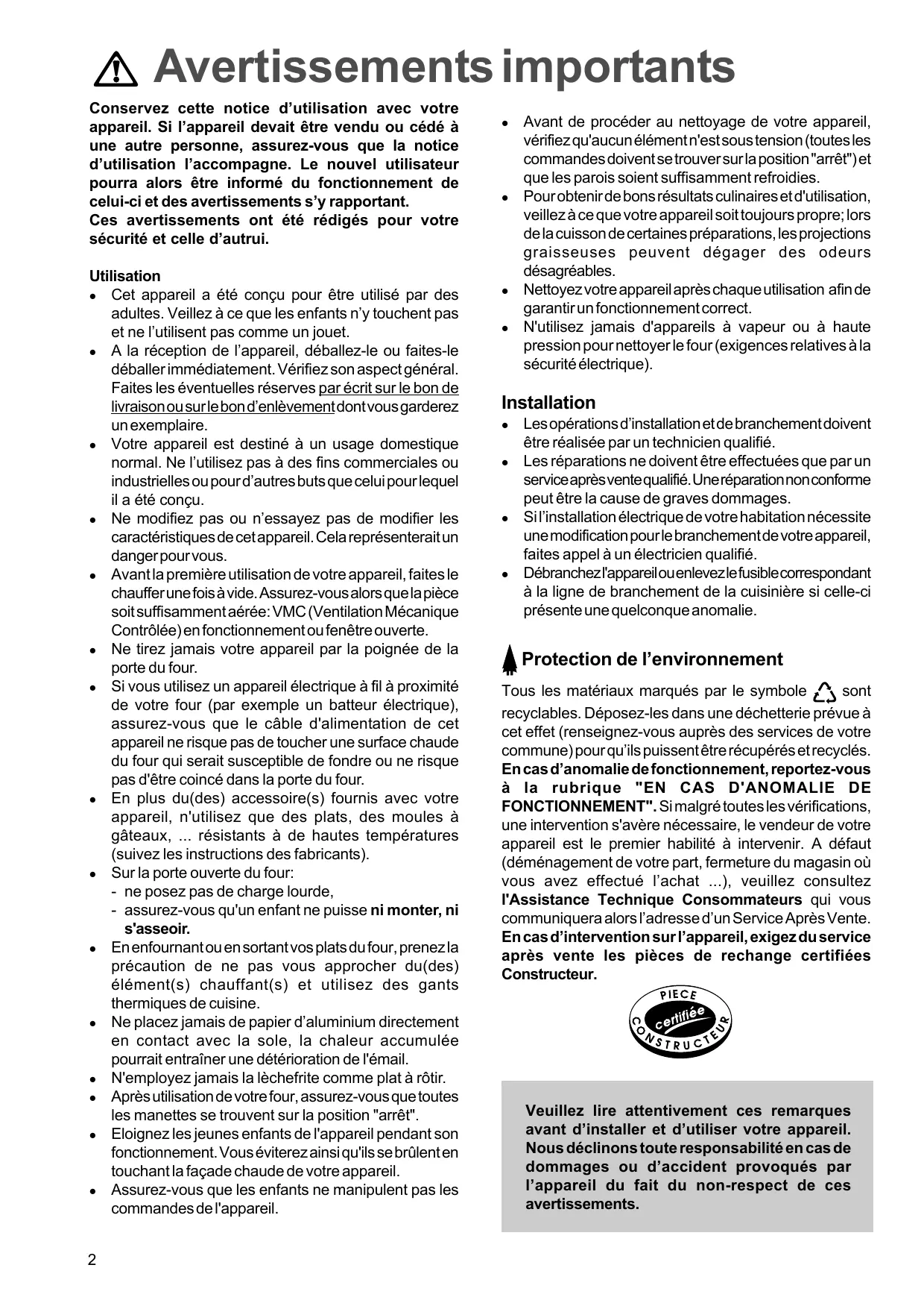 Tous les matériaux marqués par le symbole Ls sont recyclables. Déposez-les dans une déchetterie prévue à cet effet (renseignez-vous auprès des services de votre commune) pour qu'ils puissent être récupérés etrecyclés. En cas d’anomalie de fonctionnement, reportez-vous à la rubrique "EN CAS D'ANOMALIE DE FONCTIONNEMENT". Si malgré toutes les vérifications, une intervention s'avère nécessaire, le vendeur de votre appareil est le premier habilité à intervenir. A défaut (déménagement de votre part, fermeture du magasin où vous avez effectué l'achat .), veuillez consultez l'Assistance Technique Consommateurs qui vous communiquera alors l'adresse d’un Service Après Vente. En cas d'intervention sur l’appareil, exigez du service après vente les pièces de rechange certifiées Constructeur.