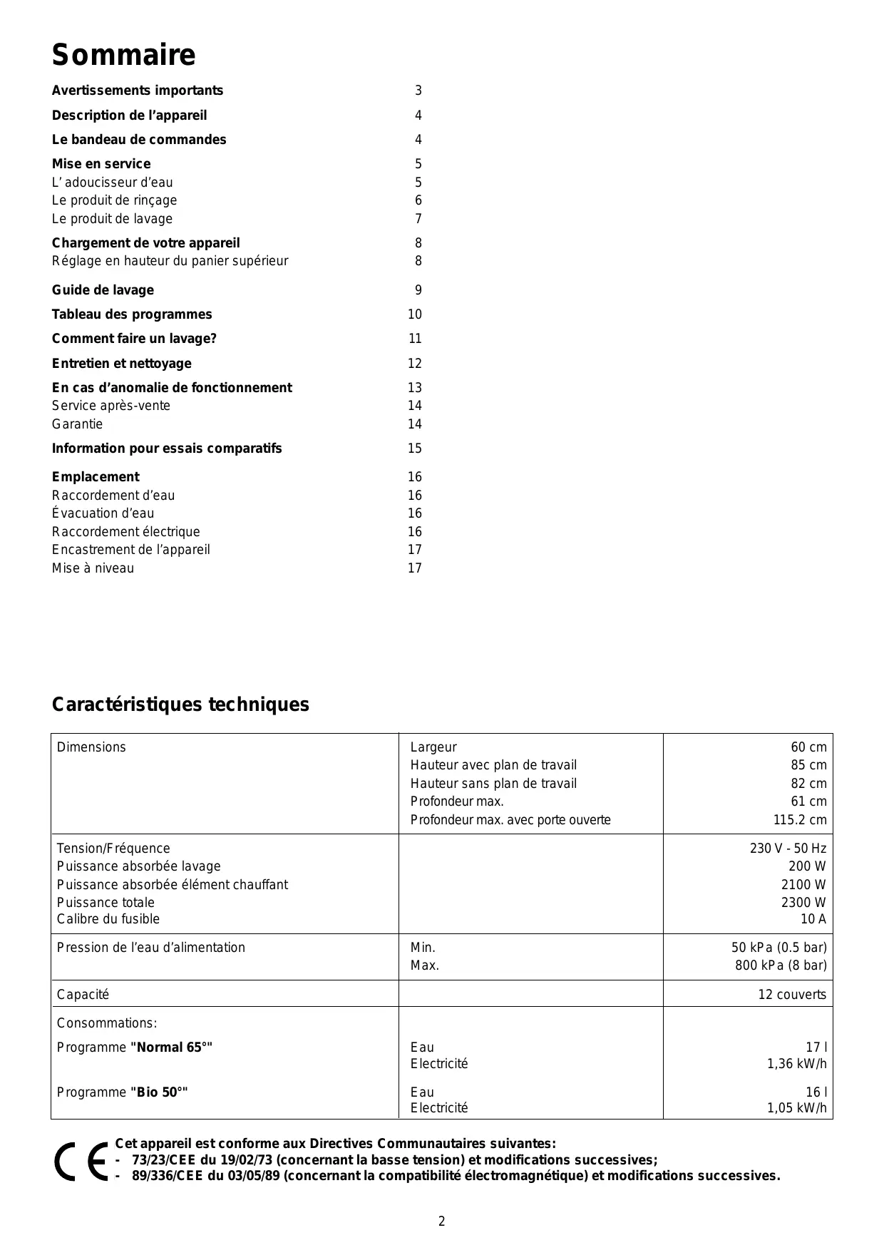 Cet appareil est conforme aux Directives Communautaires suivantes: - 73/23/CEE du 19/02/73 (concernant la basse tension) et modifications successives; - 89/336/CEE du 03/05/89 (concernant la compatibilité électromagnétique) et modifications successives. 2