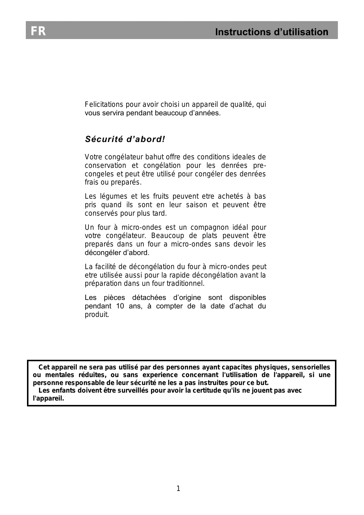 Inhalt Felicitations pour avoir choisi un appareil de qualité, qui vous servira pendant beaucoup d’années. Sécurité d’abord! Votre congélateur bahut offre des conditions ideales de conservation et congélation pour les denrées precongeles et peut être utilisé pour congéler des denrées frais ou preparés. Les légumes et les fruits peuvent etre achetés à bas pris quand ils sont en leur saison et peuvent être conservés pour plus tard. Un four à micro-ondes est un compagnon idéal pour votre congélateur. Beaucoup de plats peuvent être preparés dans un four a micro-ondes sans devoir les décongéler d’abord. La facilité de décongélation du four à micro-ondes peut etre utilisée aussi pour la rapide décongélation avant la préparation dans un four traditionnel. Les pièces détachées d’origine sont disponibles pendant 10 ans, à compter de la date d’achat du produit. Cet appareil ne sera pas utilisé par des personnes ayant capacites physiques, sensorielles ou mentales réduites, ou sans experience concernant l'utilisation de l'appareil, si une personne responsable de leur sécurité ne les a pas instruites pour ce but. Les enfants doivent être surveillés pour avoir la certitude qu'ils ne jouent pas avec l'appareil.
