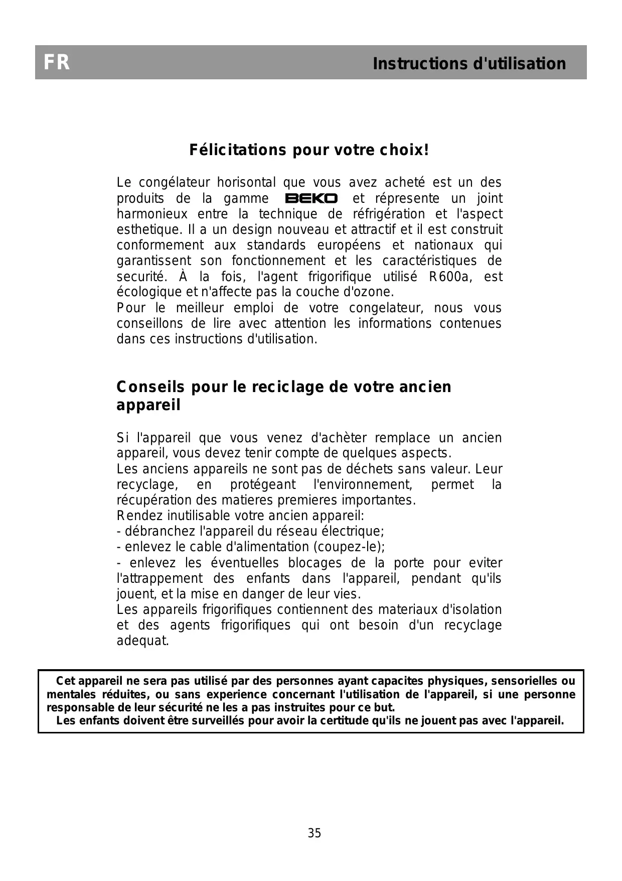 Félicitations pour votre choix! Le congélateur horisontal que vous avez acheté est un des produits de la gamme BEKO et répresente un joint harmonieux entre la technique de réfrigération et l'aspect esthetique. Il a un design nouveau et attractif et il est construit conformement aux standards européens et nationaux qui garantissent son fonctionnement et les caractéristiques de securité. À la fois, l'agent frigorifique utilisé R600a, est écologique et n'affecte pas la couche d'ozone. Pour le meilleur emploi de votre congelateur, nous vous conseillons de lire avec attention les informations contenues dans ces instructions d'utilisation.