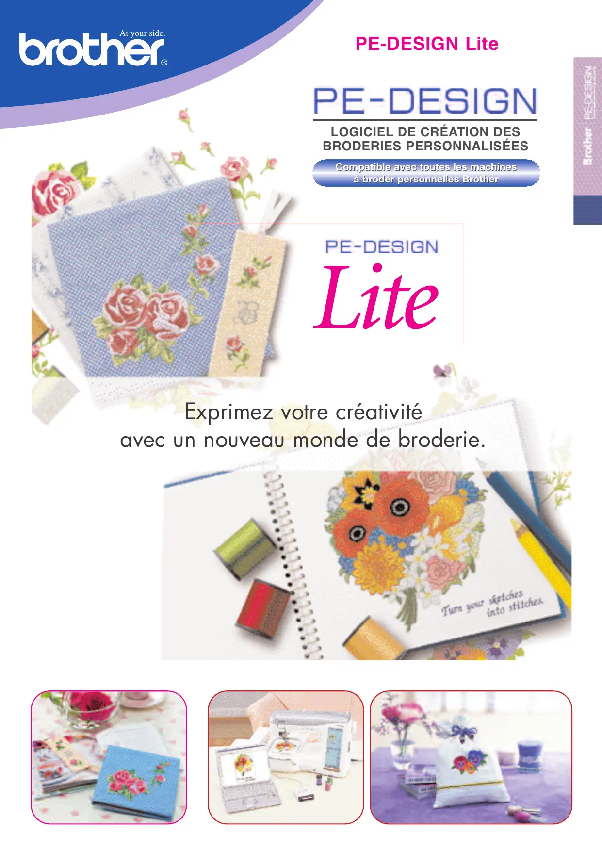 Fonctions d’édition de texte Police Disposition du texte 35 polices de caractères intégrées Sur la courbe droit/arc de cercle Espacement Tout le texte Conversion d’image Auto Punch Oui Attributs de broderie Basique Attributs de broderie Allez encore plus loin dans votre créativité ! Type de points de remplissage Affichage Evolutif, le PE-DESIGN Lite pourra évoluer vers une version de logiciel de broderie plus complète grâce à une mise à jour donnant les fonctions du PE-DESIGN version 7. Pour vous permettre de découvrir le PE-DESIGN version 7, le PE-DESIGN Lite est livré avec un cd-rom de démonstration et un comparatif des fonctionnalités. Vous découvrirez ainsi une multitude de nouvelles possibilités qui vous enchantera. Accessoires en option Cartes de broderie (A acheter séparément.) Des centaines de motifs de broderie extraordinaires ! 2 (plumetis/point de remplissage) Aperçu Oui Aperçu réaliste Oui Fils à broder Grand choix de fils à broder de haute qualité dont des fils métalliques et des fils de couleurs chair. Windows est une marque déposée de Microsoft Corporation aux Etats-Unis et/ou dans d’autres pays. © 2006 BROTHER INDUSTRIES, LTD, NAGOYA, JAPON. Toutes les déclarations sont valables au moment de l’impression. Brother est une marque déposée de Brother Industries, Ltd. Les noms des produits sont des marques déposées ou marques de leurs sociétés respectives. La disponibilité des fonctions et des accessoires peut varier d’un pays à l’autre. Spécifications sujettes à modification sans préavis. *A vos côtés - ZLFT01F0529 Votre Spécialiste Brother :