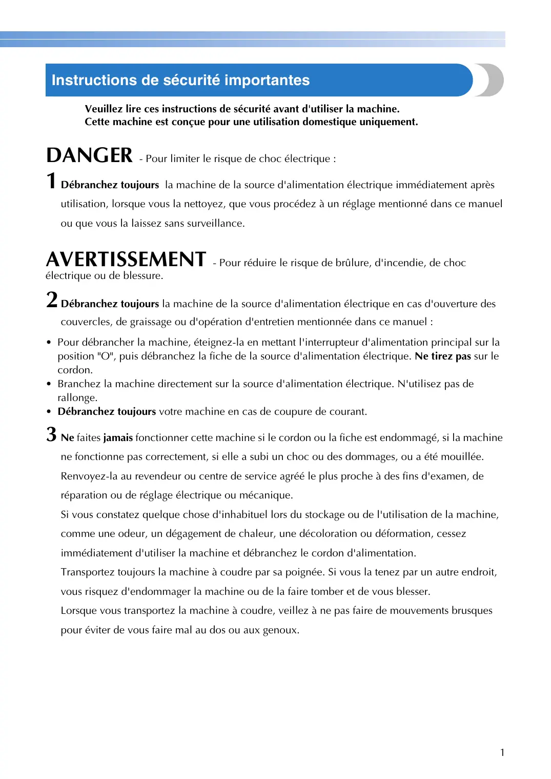 - Débranchez toujours votre machine en cas de coupure de courant. 3 Ne faites jamais fonctionner cette machine si le cordon ou la fiche est endommagé, si la machine ne fonctionne pas correctement, si elle a subi un choc ou des dommages, ou a été mouillée. Renvoyez-la au revendeur ou centre de service agréé le plus proche à des fins d'examen, de réparation ou de réglage électrique ou mécanique. Si vous constatez quelque chose d'inhabituel lors du stockage ou de l'utilisation de la machine, comme une odeur, un dégagement de chaleur, une décoloration ou déformation, cessez immédiatement d'utiliser la machine et débranchez le cordon d'alimentation. Transportez toujours la machine à coudre par sa poignée. Si vous la tenez par un autre endroit, vous risquez d'endommager la machine ou de la faire tomber et de vous blesser. Lorsque vous transportez la machine à coudre, veillez à ne pas faire de mouvements brusques pour éviter de vous faire mal au dos ou aux genoux.