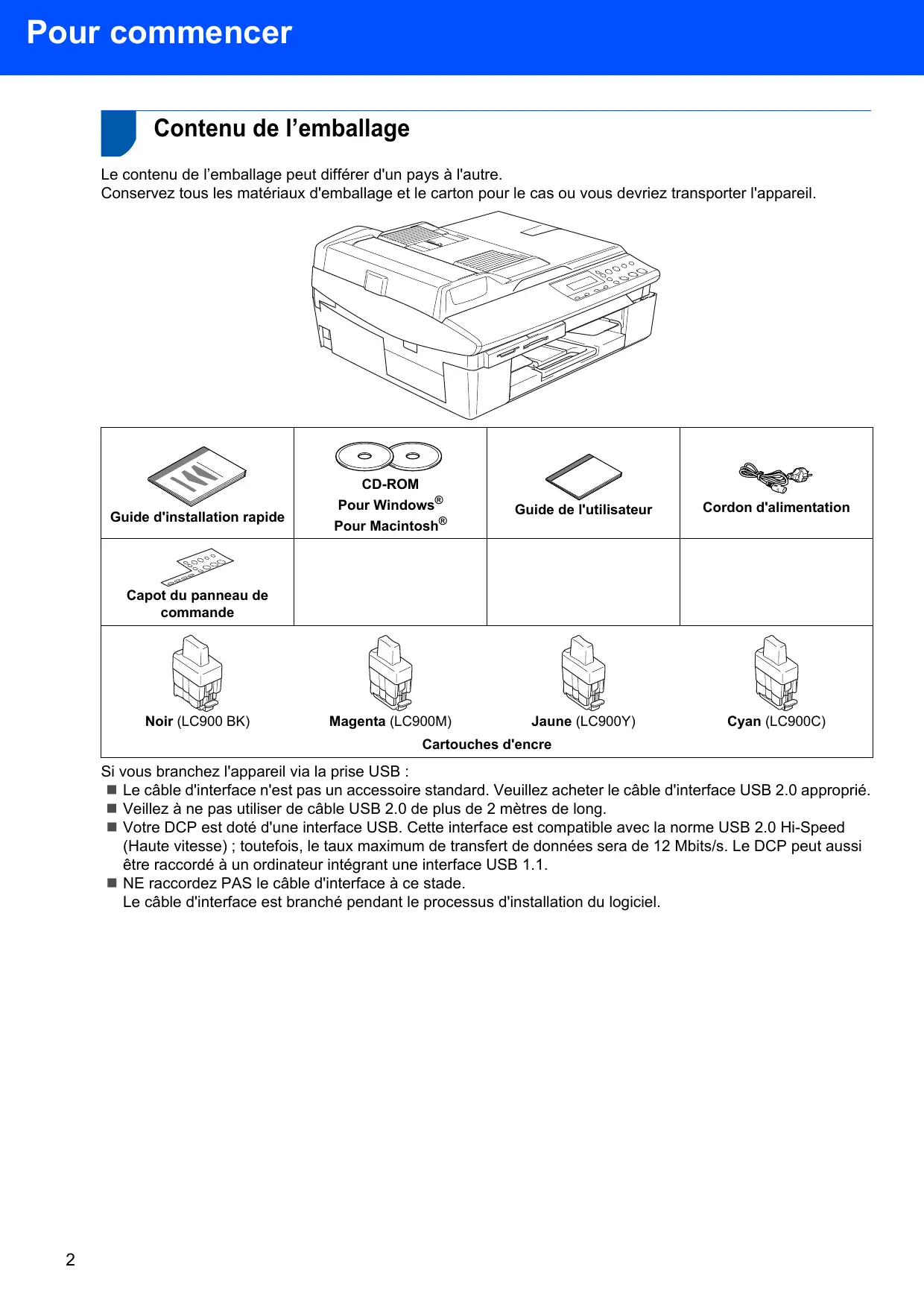 Pour commencer D Contenu de l'emballage Le contenu de l'emballage peut différer d'un pays à l'autre. Conservez tous les matériaux d'emballage et le carton pour le cas ou vous devriez transporter l'appareil. CD-ROM Pour Windows® Guide de l'utilisateur Cordon d'alimentation Pour Macintosh® Guide d'installation rapide Capot du panneau de commande Noir (LC900 BK) Magenta (LC900M) Jaune (LC900Y) Cyan (LC900C) Cartouches d'encre Si vous branchez l'appareil via la prise USB : m Le câble d'interface n'est pas un accessoire standard. Veuillez acheter le câble d'interface USB 2.0 approprié. m Veillez à ne pas utiliser de câble USB 2.0 de plus de 2 mètres de long. # Votre DCP est doté d'une interface USB. Cette interface est compatible avec la norme USB 2.0 Hi-Speed (Haute vitesse) ; toutefois, le taux maximum de transfert de données sera de 12 Mbits/s. Le DCP peut aussi être raccordé à un ordinateur intégrant une interface USB 1.1. m NE raccordez PAS le câble d'interface à ce stade. Le câble d'interface est branché pendant le processus d'installation du logiciel.