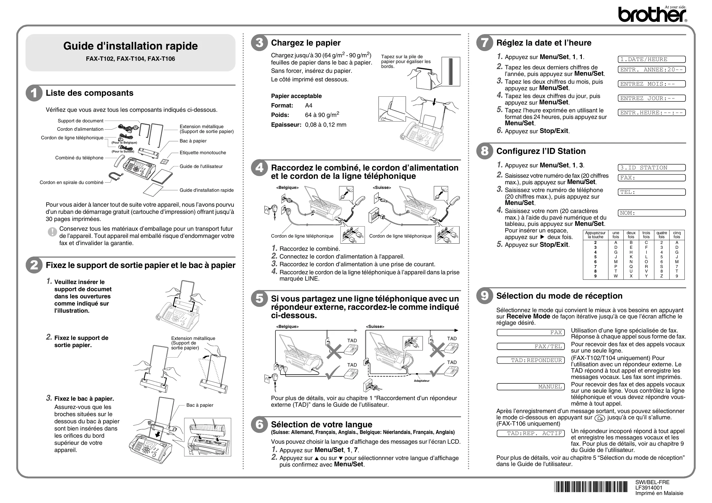 4 G | H 1 4 | G 5 skis | 6 MIN |olsl|m 7 Pplaln|s | 7 8 Tulvislr 9 wI|x|vy}]zl]e O Sélection du mode de réception Sélectionnez le mode qui convient le mieux à vos besoins en appuyant sur Receive Mode de façon itérative jusqu’à ce que l'écran affiche le réglage désiré. Utilisation d’une ligne spécialisée de fax. Réponse à chaque appel sous forme de fax. FAX/TEL) Pour recevoir des fax et des appels vocaux sur une seule ligne. (FAX-T102/T104 uniquement) Pour l’utilisation avec un répondeur externe. Le TAD répond à tout appel et enregistre les messages vocaux. Les fax sont imprimés. Pour recevoir des fax et des appels vocaux sur une seule ligne. Vous contrôlez la ligne téléphonique et vous devez répondre vous- même à tout appel. Après l'enregistrement d'un message sortant, vous pouvez sélectionner le mode ci-dessous en appuyant sur jusqu’à ce qu'il s'allume. (FAX-T106 uniquement) Un répondeur incoporé répond à tout appel et enregistre les messages vocaux et les fax. Pour plus de détails, voir au chapitre 9 du Guide de l'utilisateur. Pour plus de détails, voir au chapitre 5 “Sélection du mode de réception” dans le Guide de l'utilisateur. SWIBEL-FRE IMEMAMNUMUUN Less Imprimé en Malaisie