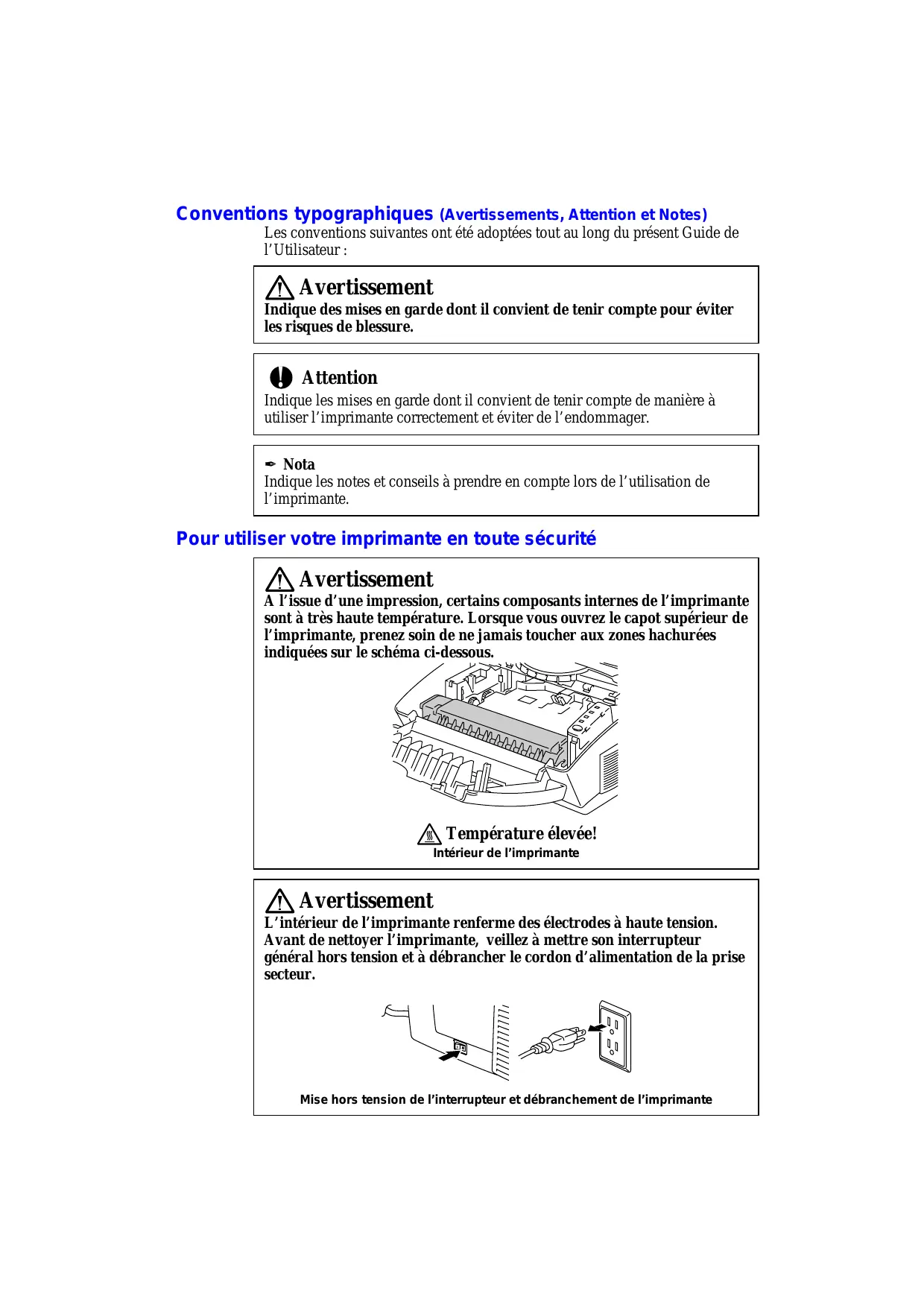 Attention Indique les mises en garde dont il convient de tenir compte de manière à utiliser l’imprimante correctement et éviter de l’endommager. ✒ Nota Indique les notes et conseils à prendre en compte lors de l’utilisation de l’imprimante. Pour utiliser votre imprimante en toute sécurité Avertissement A l’issue d’une impression, certains composants internes de l’imprimante sont à très haute température. Lorsque vous ouvrez le capot supérieur de l’imprimante, prenez soin de ne jamais toucher aux zones hachurées indiquées sur le schéma ci-dessous. Température élevée! Intérieur de l’imprimante Avertissement L’intérieur de l’imprimante renferme des électrodes à haute tension. Avant de nettoyer l’imprimante, veillez à mettre son interrupteur général hors tension et à débrancher le cordon d’alimentation de la prise secteur. Mise hors tension de l’interrupteur et débranchement de l’imprimante Transport de l’imprimante Si vous avez à transporter l’imprimante, pour quelque motif que ce soit, emballez-la avec soin de manière à éviter tout dommage au cours du trajet. Nous vous conseillons de conserver et d’utiliser son emballage d’origine. Veillez également à assurer l’imprimante correctement auprès de votre transporteur. Avertissement Lors du transport de l’imprimante, l’ensemble TAMBOUR ET CARTOUCHE DE TONER doit être retiré de l’imprimante et placé dans le sac plastique fourni. Le non respect de cette instruction en cas de transit risque d’endommager gravement l’imprimante et entraînera l’ANNULATION DE LA GARANTIE. 1 Enlevez le tambour. 3 Enlevez le câble d’alimentation et l’extension métallique du support papier de l’imprimante. Remballez l’imprimante. Voir la section “REMBALLAGE DE L’IMPRIMANTE” au Chapitre 5. 2 Placez-le dans le sac plastique et scellez le sac sur toute sa longueur. (Pour le CANADA uniquement) Pour joindre le support technique et le service d’assistance à la clientèle Brother, téléphonez au : 1-800-853-6660 1-514-685-6464 (région de Montréal) Si vous avez des commentaires ou suggestions, veuillez nous écrire à l’adresse suivante : La Corporation International Brother (Canada) Ltée. - Marketing 1, rue Hôtel de Ville Dollard-des-Ormeaux, PQ Canada H9B 3H6 BBS Pour télécharger des pilotes à partir de notre bulletin électronique, composez le 1-514-685-2040. Une fois en communication, veuillez entrer votre prénom, votre nom, puis un mot de passe de quatre chiffres. Notre BBS supporte des vitesses de modem pouvant aller jusqu’à 14,400 bauds et il est configuré sur 8 bits, sans parité, 1 bit d’arrêt.