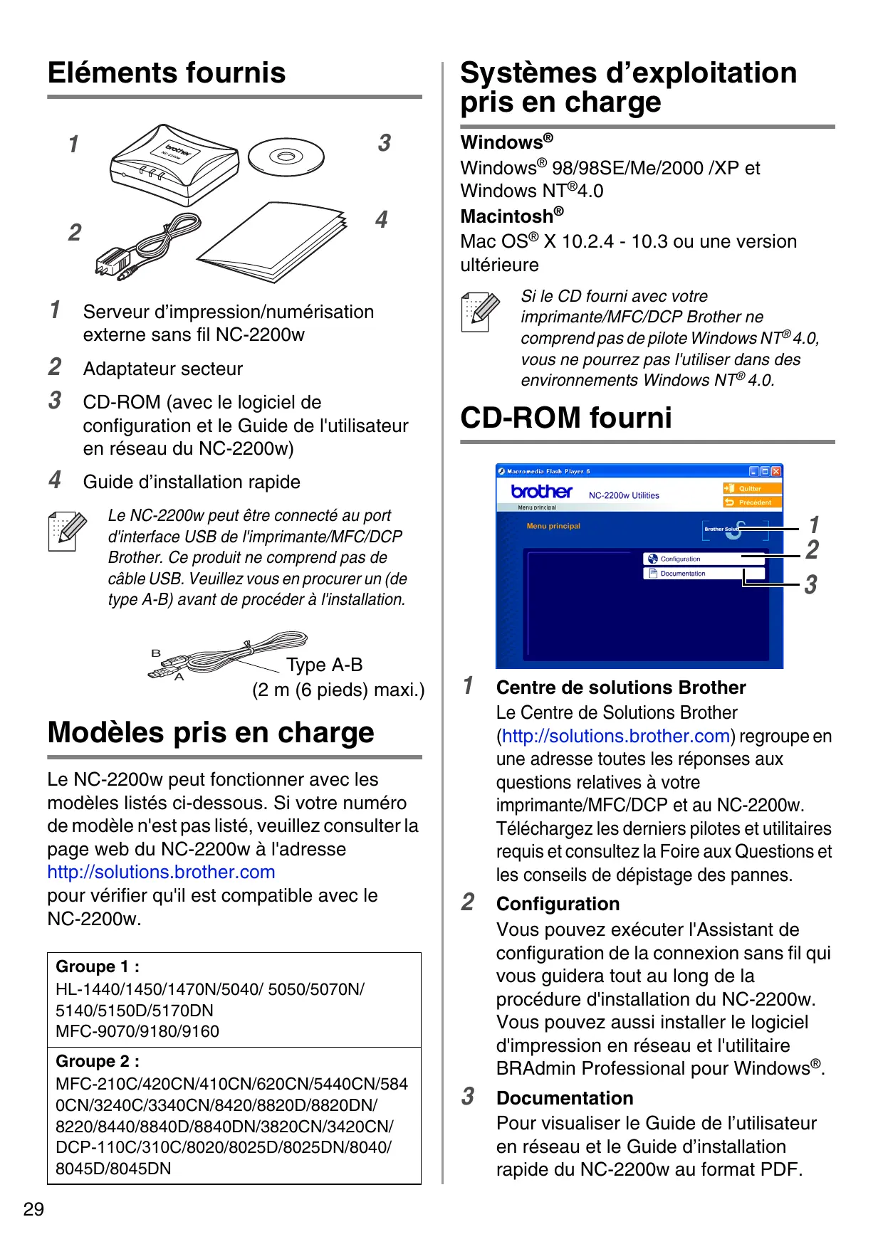 Le NC-2200w peut fonctionner avec les modèles listés ci-dessous. Si votre numéro de modèle n'est pas listé, veuillez consulter la page web du NC-2200w à l'adresse http://solutions.brother.com
