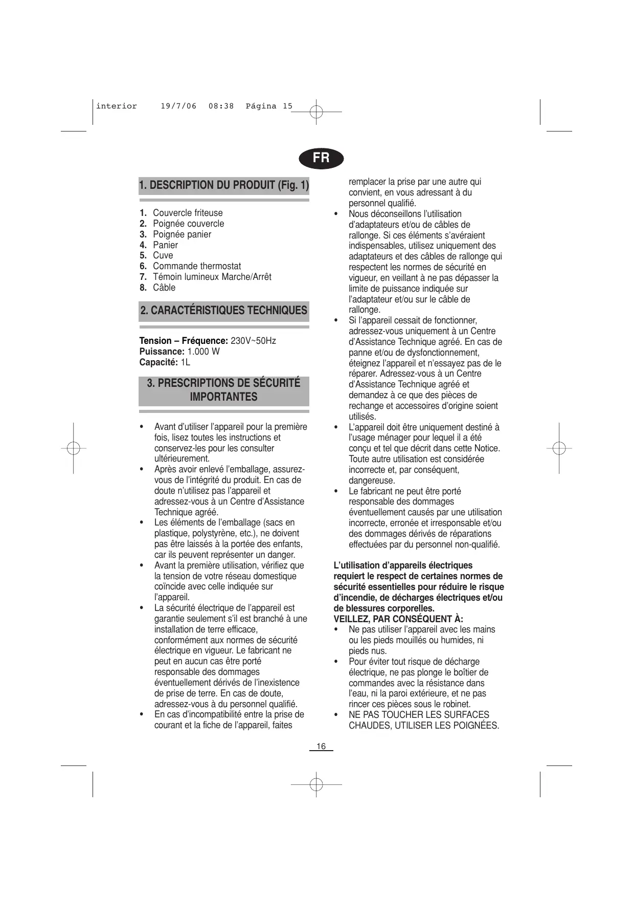 Tension – Fréquence: 230V~50Hz Puissance: 1.000 W Capacité: 1L Avant d’utiliser l’appareil pour la première fois, lisez toutes les instructions et conservez-les pour les consulter ultérieurement. Après avoir enlevé l’emballage, assurezvous de l’intégrité du produit. En cas de doute n’utilisez pas l’appareil et adressez-vous à un Centre d’Assistance Technique agréé. Les éléments de l’emballage (sacs en plastique, polystyrène, etc.), ne doivent pas être laissés à la portée des enfants, car ils peuvent représenter un danger. Avant la première utilisation, vérifiez que la tension de votre réseau domestique coïncide avec celle indiquée sur l’appareil. La sécurité électrique de l’appareil est garantie seulement s’il est branché à une installation de terre efficace, conformément aux normes de sécurité électrique en vigueur. Le fabricant ne peut en aucun cas être porté responsable des dommages éventuellement dérivés de l’inexistence de prise de terre. En cas de doute, adressez-vous à du personnel qualifié. En cas d’incompatibilité entre la prise de courant et la fiche de l’appareil, faites