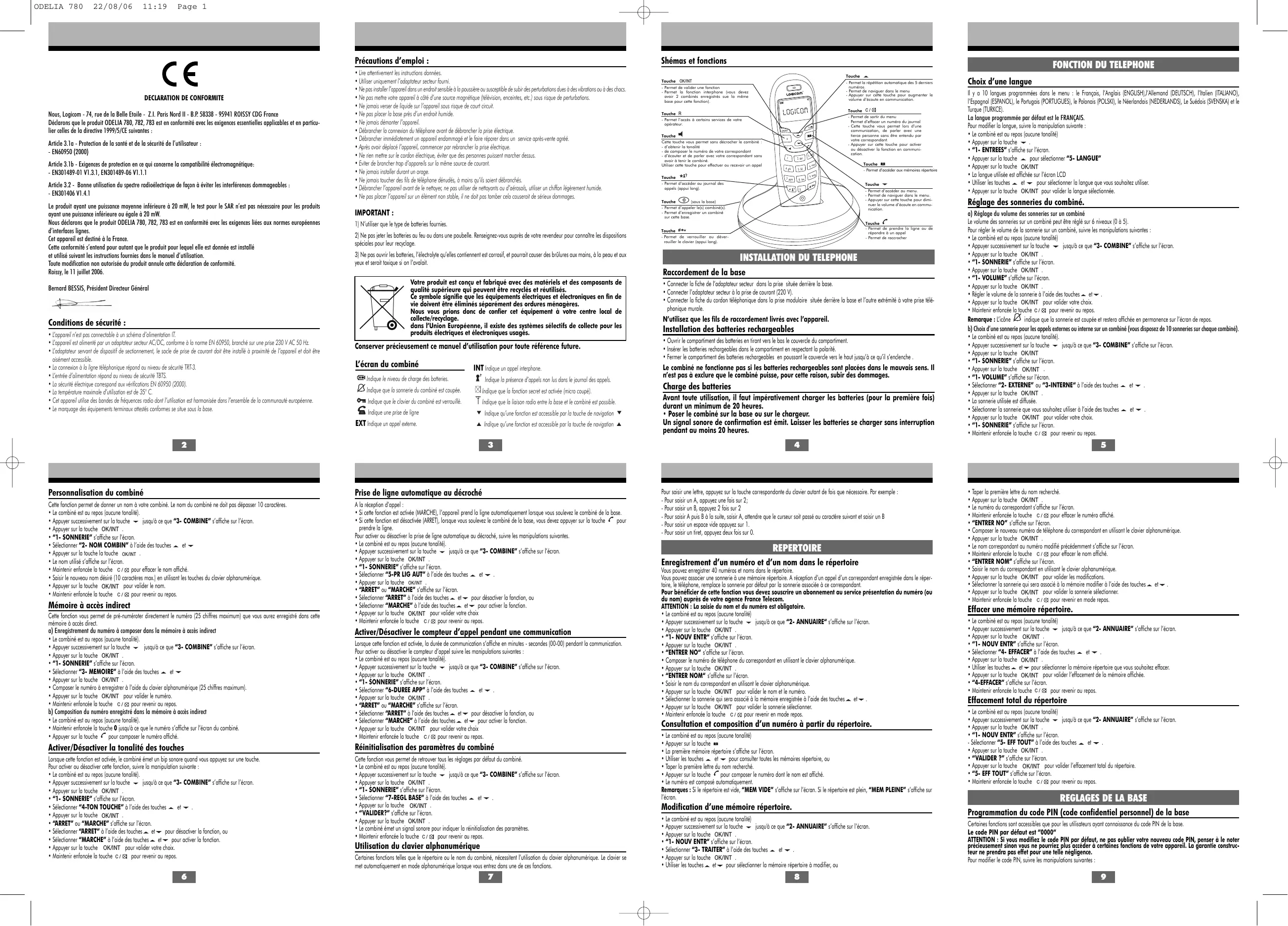 DECLARATION DE CONFORMITE Nous, Logicom - 74, rue de la Belle Etoile - Z.I. Paris Nord II - B.P. 58338 - 95941 ROISSY CDG France Déclarons que le produit ODELIA 780, 782, 783 est en conformité avec les exigences essentielles applicables et en particulier celles de la directive 1999/5/CE suivantes : Article 3.1a - Protection de la santé et de la sécurité de l’utilisateur : - EN60950 (2000) Article 3.1b - Exigences de protection en ce qui concerne la compatibilité électromagnétique: - EN301489-01 V1.3.1, EN301489-06 V1.1.1 Article 3.2 - Bonne utilisation du spectre radioélectrique de façon à éviter les interférences dommageables : - EN301406 V1.4.1 Le produit ayant une puissance moyenne inférieure à 20 mW, le test pour le SAR n’est pas nécessaire pour les produits ayant une puissance inférieure ou égale à 20 mW. Nous déclarons que le produit ODELIA 780, 782, 783 est en conformité avec les exigences liées aux normes européennes d’interfaces lignes. Cet appareil est destiné à la France. Cette conformité s’entend pour autant que le produit pour lequel elle est donnée est installé et utilisé suivant les instructions fournies dans le manuel d’utilisation. Toute modification non autorisée du produit annule cette déclaration de conformité. Roissy, le 11 juillet 2006. Bernard BESSIS, Président Directeur Général