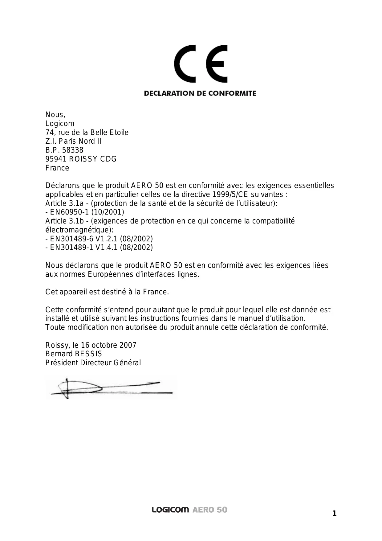 Nous, Logicom 74, rue de la Belle Etoile Z.I. Paris Nord II B.P. 58338 95941 ROISSY CDG France Déclarons que le produit AERO 50 est en conformité avec les exigences essentielles applicables et en particulier celles de la directive 1999/5/CE suivantes : Article 3.1a - (protection de la santé et de la sécurité de l’utilisateur): - EN60950-1 (10/2001) Article 3.1b - (exigences de protection en ce qui concerne la compatibilité électromagnétique): - EN301489-6 V1.2.1 (08/2002) - EN301489-1 V1.4.1 (08/2002) Nous déclarons que le produit AERO 50 est en conformité avec les exigences liées aux normes Européennes d’interfaces lignes. Cet appareil est destiné à la France. Cette conformité s’entend pour autant que le produit pour lequel elle est donnée est installé et utilisé suivant les instructions fournies dans le manuel d’utilisation. Toute modification non autorisée du produit annule cette déclaration de conformité. Roissy, le 16 octobre 2007 Bernard BESSIS Président Directeur Général