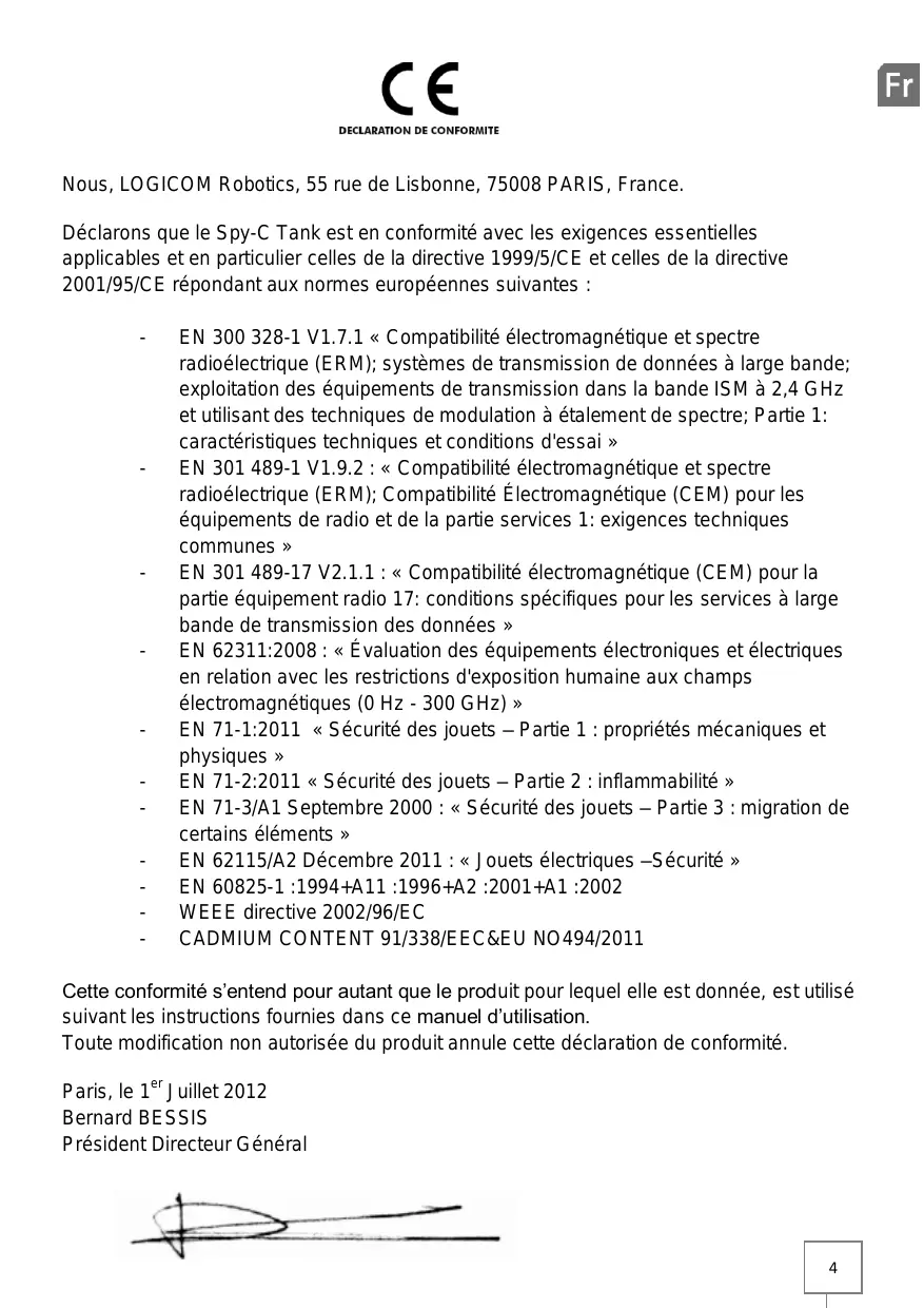 Nous, LOGICOM Robotics, 55 rue de Lisbonne, 75008 PARIS, France. Déclarons que le Spy-C Tank est en conformité avec les exigences essentielles applicables et en particulier celles de la directive 1999/5/CE et celles de la directive 2001/95/CE répondant aux normes européennes suivantes : -