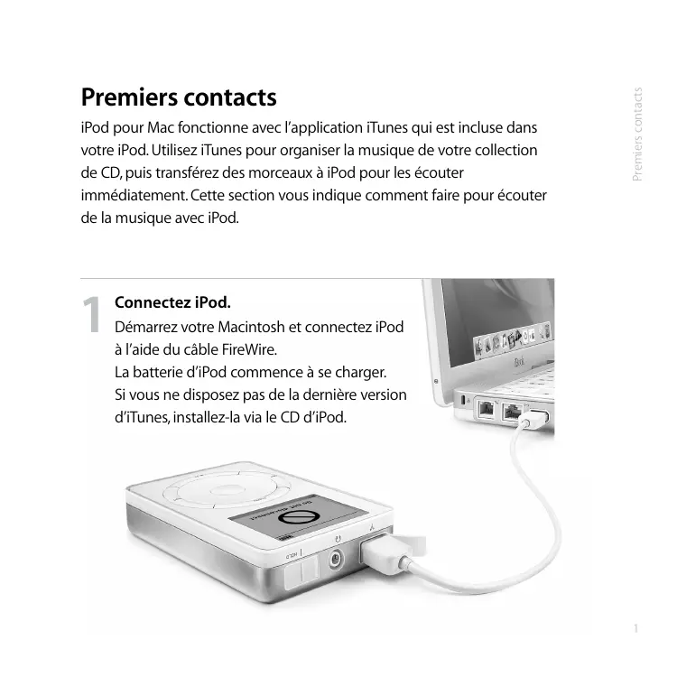 Premiers contacts Premiers contacts Connectez iPod. Démarrez votre Macintosh et connectez iPod à l’aide du câble FireWire. La batterie d’iPod commence à se charger. Si vous ne disposez pas de la dernière version d’iTunes, installez-la via le CD d’iPod.