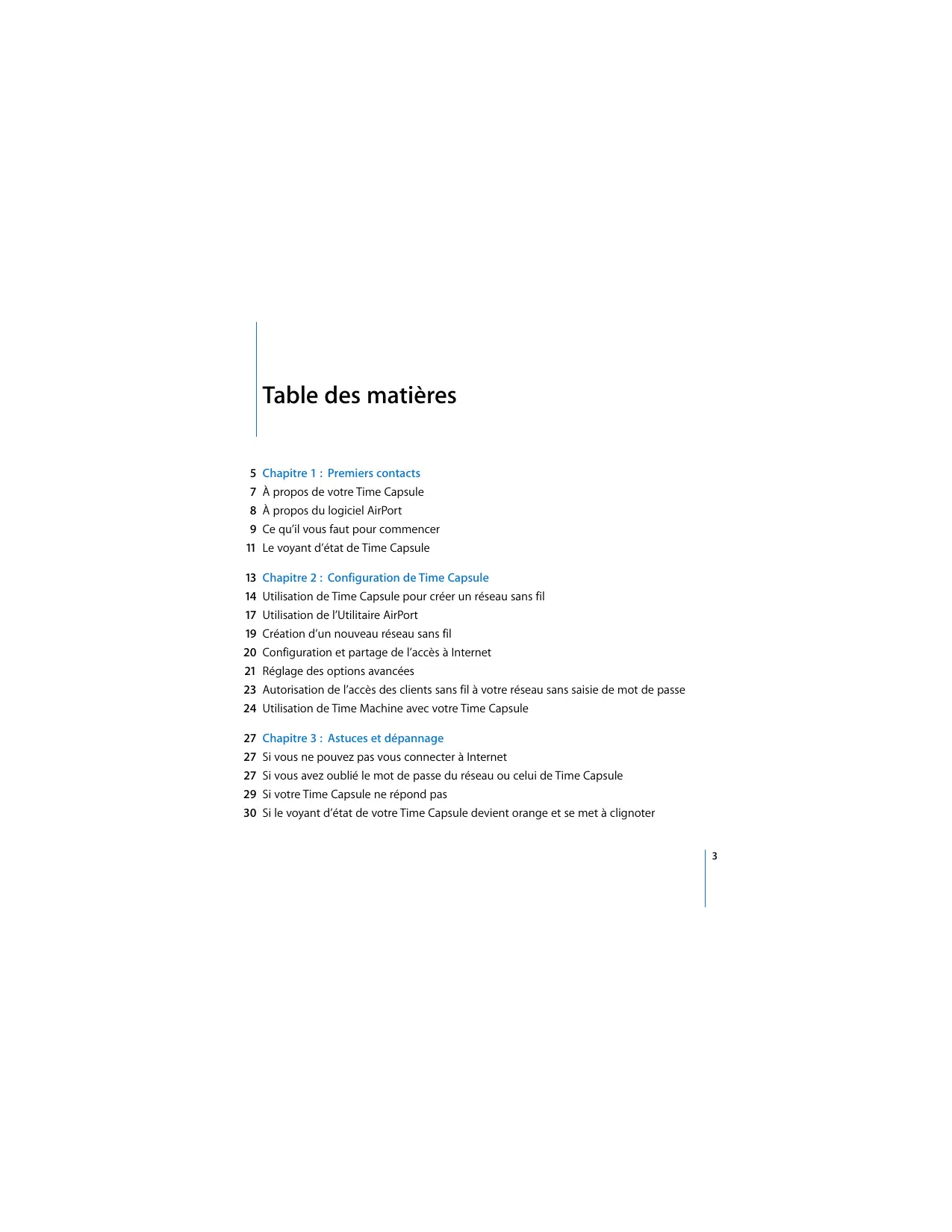 Ce chapitre fournit des informations et des instructions pour la connexion de votre Time Capsule à Internet et sa configuration à l’aide de l’Utilitaire AirPort pour créer ou se relier à un réseau sans fil. Ce chapitre décrit la procédure de connexion de votre Time Capsule à Internet, l’utilisation de l’Assistant réglages dans l’Utilitaire AirPort pour configurer votre réseau ainsi que d’autres fonctionnalités de votre Time Capsule. Pour en savoir plus sur la mise en réseau sans fil et sur les fonctionnalités avancées de l’Utilitaire AirPort, consultez le document « Création de réseaux AirPort 802.11n (Mac OS X v10.5 + Windows) » sur le CD AirPort ou à l’adresse www.apple.com/fr/support/airport. Après l’installation de l’Utilitaire AirPort depuis le CD fourni avec votre Time Capsule, vous pouvez réaliser la majeure partie de la configuration de votre réseau et de vos tâches de configuration grâce à l’Assistant réglages de l’Utilitaire AirPort. Pour régler des options avancées, choisissez Configuration manuelle dans le menu Borne d’accès de l’Utilitaire AirPort. Voir « Réglage des options avancées » à la page 21.