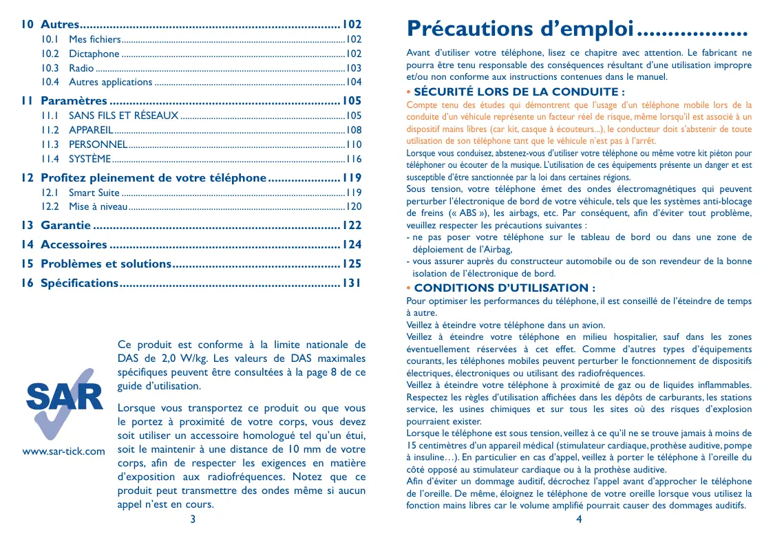 13 Garantie 14 Accessoires 15 Problèmes et solutions. 16 Spécification: Ce produit est conforme à la limite nationale de DAS de 2,0 W/kg. Les valeurs de DAS maximales spécifiques peuvent être consultées à la page 8 de ce S guide d'utilisation. Lorsque vous transportez ce produit ou que vous le portez à proximité de votre corps, vous devez soit utiliser un accessoire homologué tel qu'un étui, wwwsartick.com _ Soit le maintenir à une distance de 10 mm de votre corps, afin de respecter les exigences en matière d'exposition aux radiofréquences. Notez que ce produit peut transmettre des ondes même si aucun appel n'est en cours.