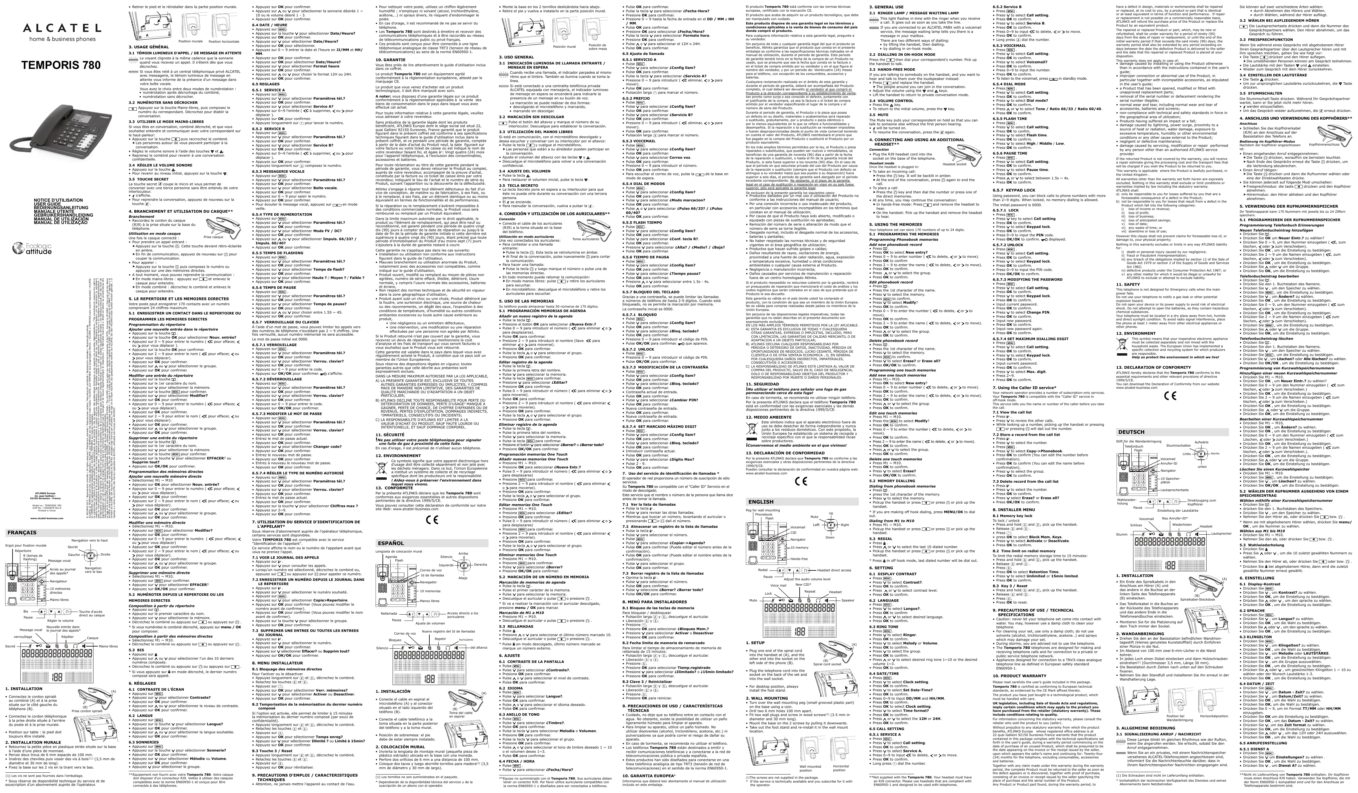 Par la présente ATLINKS déclare que les Temporis 780 sont conformes aux exigences essentielles et autres dispositions pertinentes de la directive 1999/5/CE. Vous pouvez consulter cette déclaration de conformité sur notre site Web: www.alcatel-business.com ESPAÑOL Lengüeta de colocación mural Silencio Agenda Flash Arriba Derecha Izquierda Correo de voz Id de llamadas Manos libres