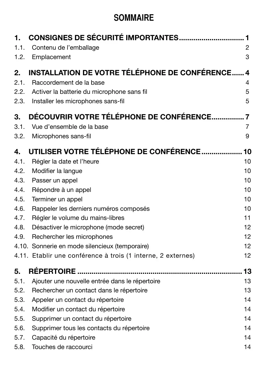 UTILISER VOTRE TÉLÉPHONE DE CONFÉRENCE..................... 10 Régler la date et l’heure Modifier la langue Passer un appel Répondre à un appel Terminer un appel Rappeler les derniers numéros composés Régler le volume du mains-libres Désactiver le microphone (mode secret) Rechercher les microphones Sonnerie en mode silencieux (temporaire) Etablir une conférence à trois (1 interne, 2 externes)