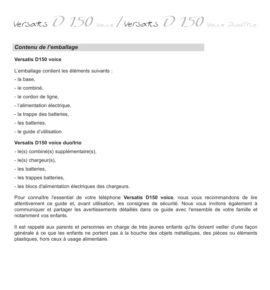 Guide d’utilisation Contenu de l’emballage Versatis D150 voice L’emballage contient les éléments suivants : - la base, - le combiné, - le cordon de ligne, - l’alimentation électrique, - la trappe des batteries, - les batteries, - le guide d’utilisation. Versatis D150 voice duo/trio - le(s) combiné(s) supplémentaire(s), - le(s) chargeur(s), - les batteries, - les trappes batteries, - les blocs d'alimentation électriques des chargeurs. Pour connaître l'essentiel de votre téléphone Versatis D150 voice, nous vous recommandons de lire attentivement ce guide et, avant utilisation, les consignes de sécurité. Nous vous invitons également à communiquer et partager les avertissements détaillés dans ce guide avec l'ensemble de votre famille et notamment vos enfants. Il est rappelé aux parents et personnes en charge de très jeunes enfants qu'ils doivent veiller d'une façon générale à ce que les enfants ne portent pas à la bouche des objets métalliques, des pièces ou éléments plastiques, hors ceux à usage alimentaire. Les touches du combiné - Décrocher - Verrouiller le clavier (appui long) - Augmenter / Réduire le volume sonore de l’écouteur - Accès aux derniers appels reçus* - Raccrocher - Allumer / Eteindre le combiné - Accès aux derniers numéros composés - Insertion d’une pause en numérotation - Accès au répertoire - Accès au menu - Validation - Flash / Accès à des services opérateurs* - Accès aux fonctions du répondeur - Fonction Secret - Retour + Effacer - Appel interne / Conférence - Accès à un service opérateur* Icônes de l’écran principal Communication externe en cours Appels reçus non répondus* Nouveau message vocal sur la messagerie de l’opérateur Fixe : indique de nouveaux messages vocaux sur le répondeur Niveau de charge des batteries Fixe : bonne qualité de réception Micro coupé Clignotant : qualité de réception insuffisante ou combiné non associé Alarme activée