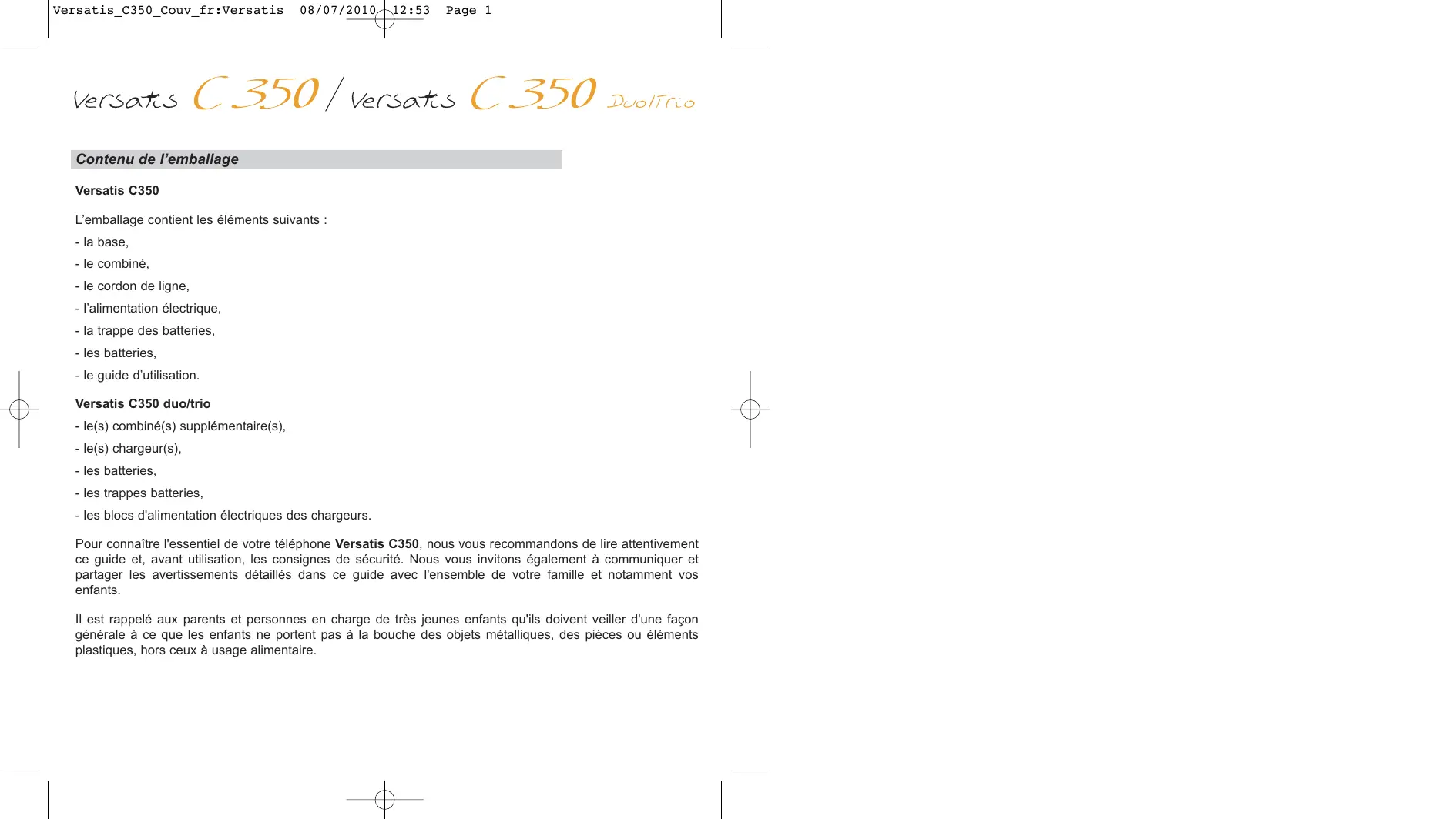 Versatis_C350_1ère_couv_fr:Versatis 09/07/2010 12:29 Page 1 Guide d’utilisation Versatis_C350_Couv_fr:Versatis 08/07/2010 12:53 Page 1 Contenu de l’emballage Versatis C350 L’emballage contient les éléments suivants : - la base, - le combiné, - le cordon de ligne, - l’alimentation électrique, - la trappe des batteries, - les batteries, - le guide d’utilisation. Versatis C350 duo/trio - le(s) combiné(s) supplémentaire(s), - le(s) chargeur(s), - les batteries, - les trappes batteries, - les blocs d'alimentation électriques des chargeurs. Pour connaître l'essentiel de votre téléphone Versatis C350, nous vous recommandons de lire attentivement ce guide et, avant utilisation, les consignes de sécurité. Nous vous invitons également à communiquer et partager les avertissements détaillés dans ce guide avec l'ensemble de votre famille et notamment vos enfants. Il est rappelé aux parents et personnes en charge de très jeunes enfants qu'ils doivent veiller d'une façon générale à ce que les enfants ne portent pas à la bouche des objets métalliques, des pièces ou éléments plastiques, hors ceux à usage alimentaire. Versatis_C350_Couv_fr:Versatis 08/07/2010 12:54 Page 2 Icônes de l’écran principal Les touches du combiné - Décrocher - Flash / Accès à des services opérateurs* - Raccrocher - Allumer / Eteindre le combiné - Dans les menus : retour à l'écran d'accueil - Accès au répertoire - Accès au menu - Validation - Fonction Secret - Verrouiller le clavier (appui long) EXT INT Communication externe/interne en cours Micro coupé (fonction secret activée) Appels reçus non répondus* Alarme activée Fixe : bonne qualité de réception Nouveau message vocal sur la messagerie de l’opérateur* Clignotant : qualité de réception insuffisante ou combiné non associé - Augmenter le volume sonore de l’écouteur, du mains libres Niveau de charge des batteries - Accès aux derniers appels reçus* Clavier verrouillé Indicateurs lumineux et touche de la base - Accès aux derniers numéros composés - Appui court : Recherche du combiné - Insertion d’une pause en numérotation (appui long) - Appui long : Association du combiné - Diminuer le volume sonore de l'écouteur, du mains libres Vert : Fixe : alimentation secteur connectée - Retour + Effacer - Appel interne / Conférence Mains libres activé - Activer / Désactiver le mains libres Rouge : Fixe : Clignotant : - Combiné en charge - Recherche de combiné - Prise de ligne - Arrivée d'un appel - Association d'un combiné - Nouveau message