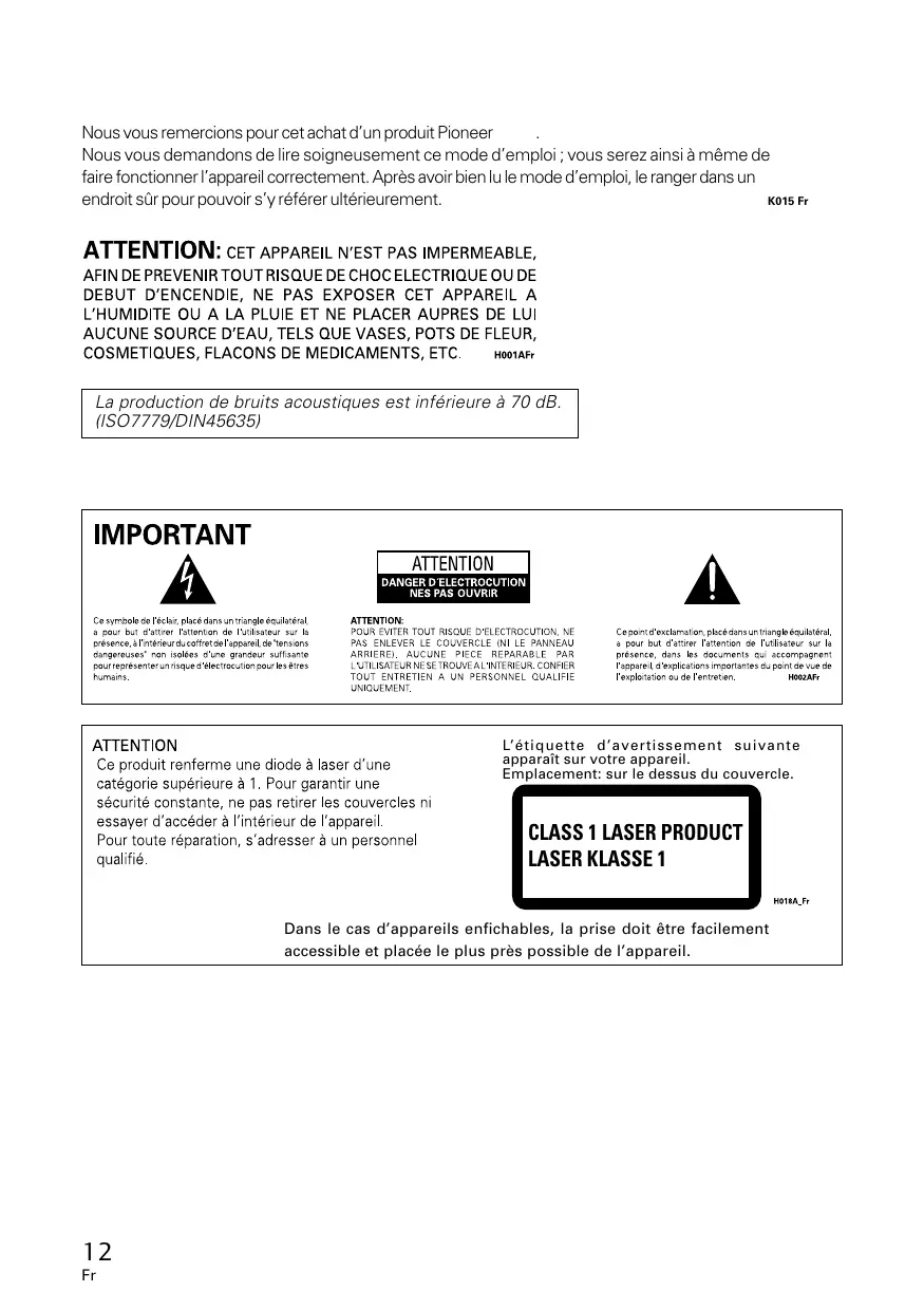 Nous vous remercions pour cet achat d’un produit Pioneer Nous vous demandons de lire soigneusement ce mode d’emploi ; vous serez ainsi à même de faire fonctionner l’appareil correctement. Après avoir bien lu le mode d’emploi, le ranger dans un endroit sûr pour pouvoir s’y référer ultérieurement. K015 Fr La production de bruits acoustiques est inférieure à 70 dB. (ISO7779/DIN45635) L’étiquette d’avertissement suivante apparaît sur votre appareil. Emplacement: sur le dessus du couvercle.