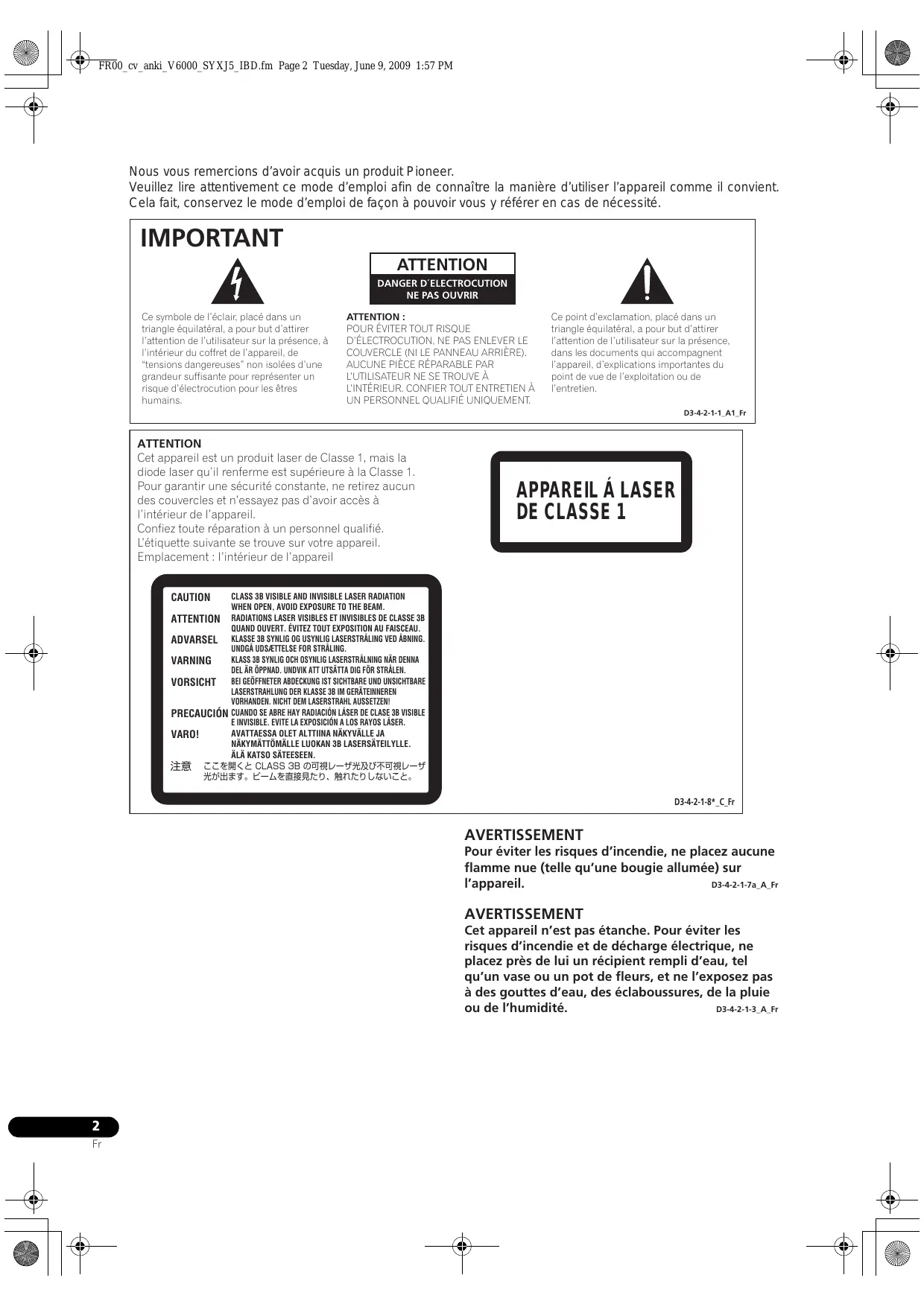 FR00_cv_anki_V6000_SYXJ5_IBD.fm Page 2 Tuesday, June 9, 2009 1:57 PM Nous vous remercions d’avoir acquis un produit Pioneer. Veuillez lire attentivement ce mode d’emploi afin de connaître la manière d’utiliser l’appareil comme il convient. Cela fait, conservez le mode d’emploi de façon à pouvoir vous y référer en cas de nécessité.