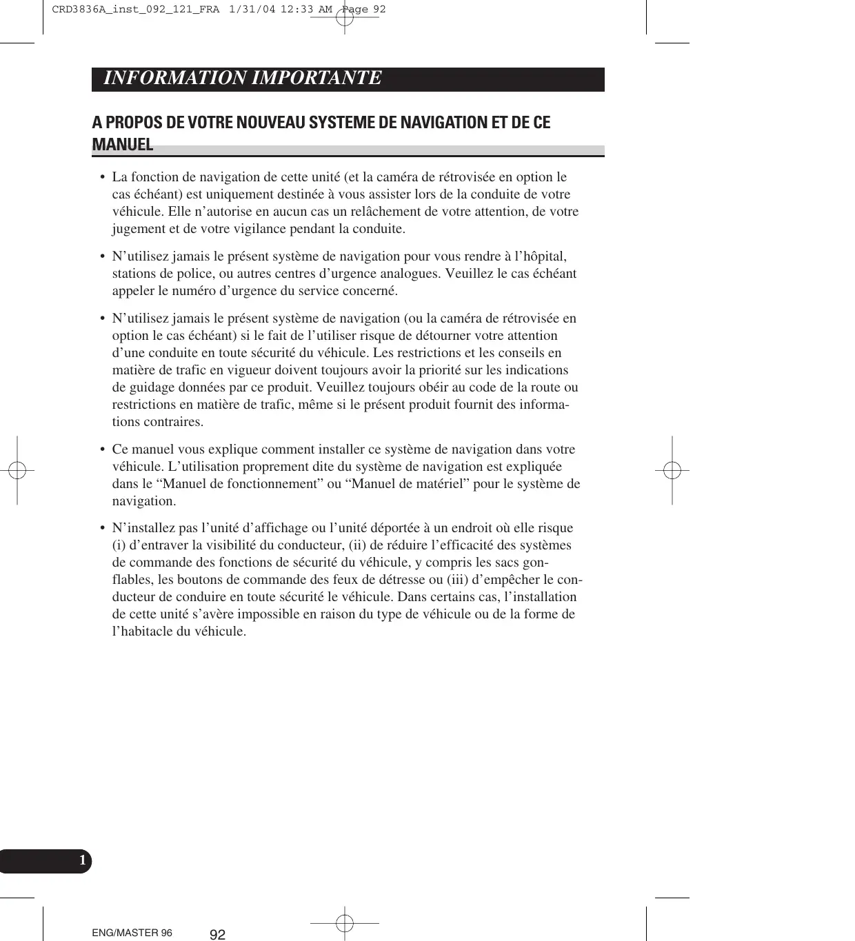système de navigation dans votre véhicule. Veuillez vous conformer à toutes les lois et réglementations en vigueur lors de l'installation et du fonctionnement de votre système de navigation. AVERTISSEMENT N’essayez pas d'installer ou d’entretenir vous-même votre système de navigation. L'installation et l’entretien effectués par un personnel non formé et non compé- tent en équipements électroniques et accessoires pour automobiles peuvent être dangereux car il y a risque d’électrocution et d’autres accidents. | ENG/MASTER 96 94