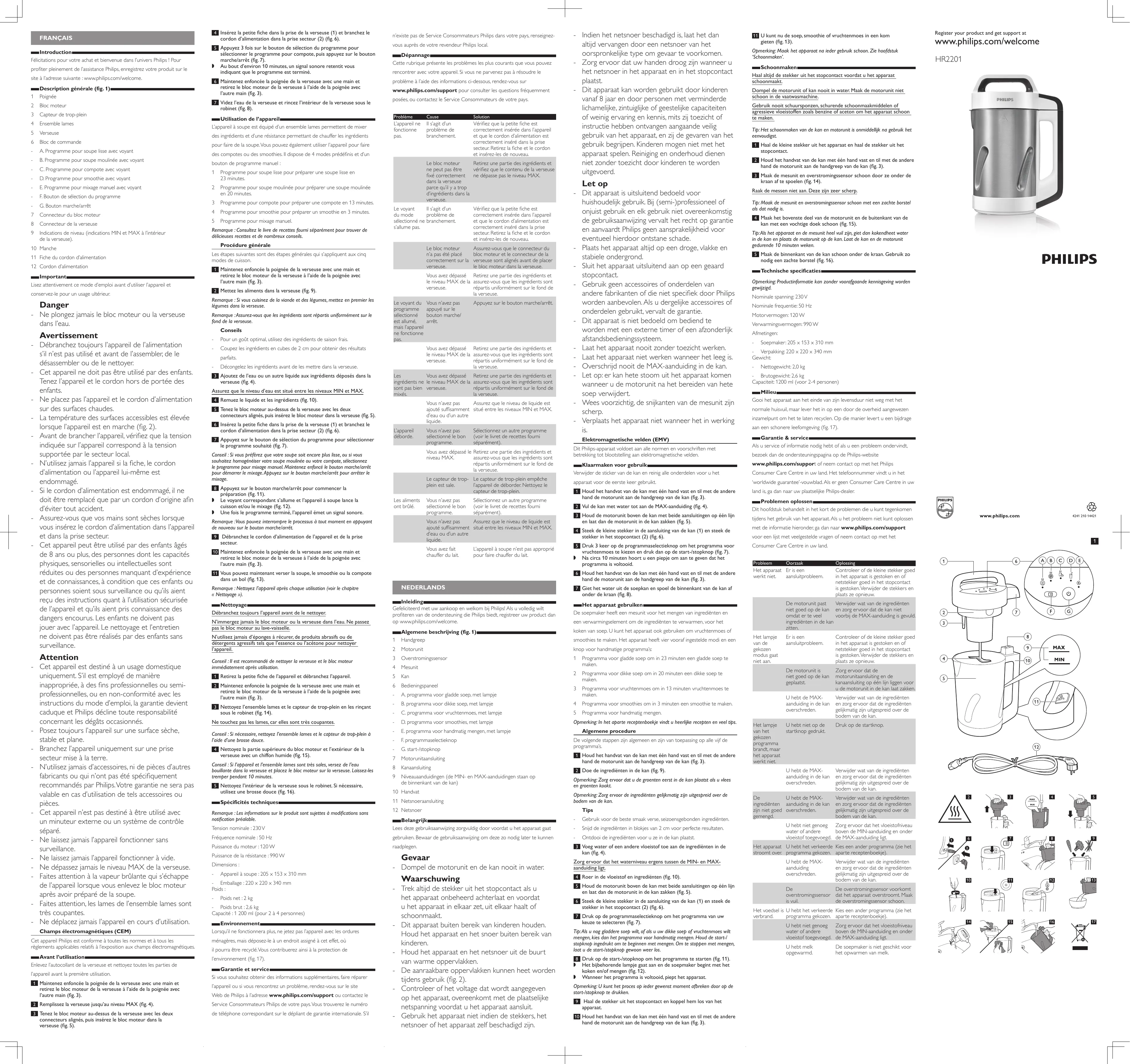 4 Programme pour smoothie pour préparer un smoothie en 3 minutes. 5 Programme pour mixage manuel. Remarque : Consultez le livre de recettes fourni séparément pour trouver de délicieuses recettes et de nombreux conseils. Procédure générale Les étapes suivantes sont des étapes générales qui s'appliquent aux cinq modes de cuisson. Maintenez enfoncée la poignée de la verseuse avec une main et retirez le bloc moteur de la verseuse à l'aide de la poignée avec l'autre main (fig. 3). Mettez les aliments dans la verseuse (fig. 9). Remarque : Si vous cuisinez de la viande et des légumes, mettez en premier les légumes dans la verseuse. Remarque :Assurez-vous que les ingrédients sont répartis uniformément sur le fond de la verseuse. Conseils = Pour un goût optimal, utilisez des ingrédients de saison frais. = Coupez les ingrédients en cubes de 2 em pour obtenir des résultats parfaits = Décongelez les ingrédients avant de les mettre dans la verseuse. Ajoutez de l'eau ou un autre liquide aux ingrédients déposés dans la verseuse (fig. 4). Assurez que le niveau d'eau est situé entre les niveaux MIN et MAX. Remuez le liquide et les ingrédients (fig. 10). Tenez le bloc moteur au-dessus de la verseuse avec les deux connecteurs alignés, puis insérez le bloc moteur dans la verseuse (fig. 5). M insérez la petite fiche dans la prise de la verseuse (1) et branchez le cordon d'alimentation dans la prise secteur (2) (fig. 6). Appuyez sur le bouton de sélection du programme pour sélectionner le programme souhaité (fig. 7). Conseil : Si vous préférez que votre soupe soit encore plus lisse, ou si vous souhaitez homogénéiser votre soupe moulinée ou votre compote, sélectionnez le programme pour mixage manuel. Maintenez enfoncé le bouton marchelarrêt pour démarrer le mixage. Appuyez sur le bouton marchelarrêt pour arrêter le mixage. El Appuyez sur le bouton marche/arrêt pour commencer la préparation (fig. 11). D Le voyant correspondant s'allume et l'appareil à soupe lance la cuisson et/ou le mixage (fig. 12). D Une fois le programme terminé, l'appareil émet un signal sonore. Remarque :Vous pouvez interrompre le processus à tout moment en appuyant de nouveau sur le bouton marchelarrêt. EX Débranchez le cordon d'alimentation de l'appareil et de la prise secteur. Maintenez enfoncée la poignée de la verseuse avec une main et retirez le bloc moteur de la verseuse à l'aide de la poignée avec l'autre main (fig. 3). Vous pouvez maintenant verser la soupe, le smoothie ou la compote dans un bol (fig. 13). Remarque : Nettoyez l'appareil après chaque utilisation (voir le chapitre « Nettoyage »). == Nettoyage Débranchez toujours l'appareil avant de le nettoyer. N'immergez jamais le bloc moteur ou la verseuse dans l'eau. Ne passez pas le bloc moteur au lave-vaisselle. N'utilisez jamais d'éponges à récurer, de produits abrasifs ou de détergents agressifs tels que l'essence ou l'acétone pour nettoyer l'appareil. Conseil : Il est recommandé de nettoyer la verseuse et le bloc moteur immédiatement après utilisation. Retirez la petite fiche de l'appareil et débranchez l'appareil. Maintenez enfoncée la poignée de la verseuse avec une main et retirez le bloc moteur de la verseuse à l'aide de la poignée avec l'autre main (fig. 3). Nettoyez l'ensemble lames et le capteur de trop-plein en les rinçant sous le robinet (fig. 14). Ne touchez pas les lames, car elles sont très coupantes. Conseil : Si nécessaire, nettoyez l'ensemble lames et le capteur de trop-plein à l'aide d'une brosse douce. Nettoyez la partie supérieure du bloc moteur et l'extérieur de la verseuse avec un chiffon humide (fig. 15). Conseil : Si l'appareil et l’ensemble lames sont très sales, versez de l’eau bouillante dans la verseuse et placez le bloc moteur sur la verseuse. Laissez-les tremper pendant 10 minutes. Nettoyez l'intérieur de la verseuse sous le robinet. Si nécessaire, utilisez une brosse douce (fig. 16). == Spécificités techniques Remarque : Les informations sur le produit sont sujettes à modifications sans notification préalable. Tension nominale : 230V Fréquence nominale : 50 Hz Puissance du moteur : 120 W Puissance de la résistance : 990 W Dimensions : = Appareil à soupe :205 x 153 x 310 mm - Emballage :220 x 220 x 340 mm Poids : = Poids net :2 kg = Poids brut : 2.6 kg Capacité : 1 200 ml (pour 2 à 4 personnes) == Environnement Lorsqu'il ne fonctionnera plus, ne jetez pas l'appareil avec les ordures ménagères, mais déposez-le à un endroit assigné à cet effet, où il pourra être recyclé. Vous contribuerez ainsi à la protection de l'environnement (fig, 17) m= Garantie et service Si vous souhaitez obtenir des informations supplémentaires, faire réparer l'appareil ou si vous rencontrez un problème, rendez-vous sur le site Web de Philips à l'adresse www.philips.com/support ou contactez le Service Consommateurs Philips de votre pays. Vous trouverez le numéro de téléphone correspondant sur le dépliant de garantie internationale. S'il