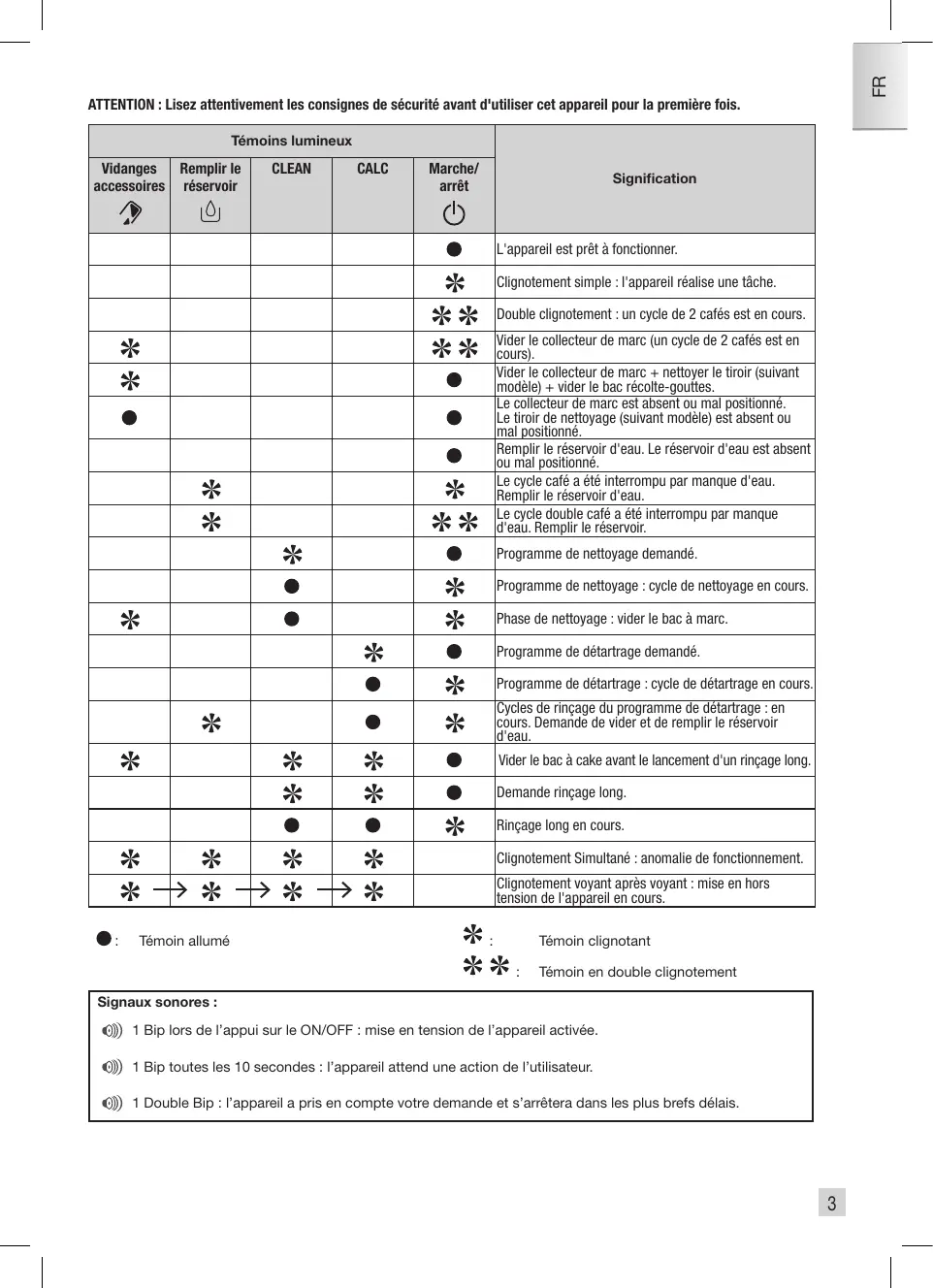 Lorsqu’il est nécessaire de procéder à un nettoyage, l’appareil vous en avertit par le clignotement du témoin lumineux