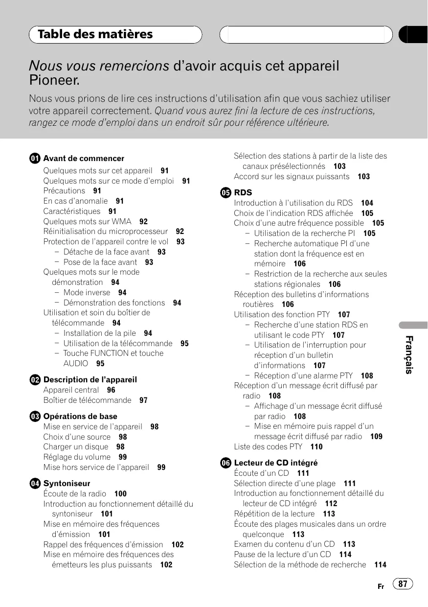 Table des matières Nous vous remercions davoir acquis cet appareil Pioneer. Nous vous prions de lire ces instructions dutilisation afin que vous sachiez utiliser votre appareil correctement. Quand vous aurez fini la lecture de ces instructions, rangez ce mode demploi dans un endroit sûr pour référence ultérieure. Avant de commencer Description de lappareil Appareil central 96 Boîtier de télécommande 97 Opérations de base Mise en service de lappareil 98 Choix dune source 98 Charger un disque 98 Réglage du volume 99 Mise hors service de lappareil 99 Syntoniseur Écoute de la radio 100 Introduction au fonctionnement détaillé du syntoniseur 101 Mise en mémoire des fréquences démission 101 Rappel des fréquences démission 102 Mise en mémoire des fréquences des émetteurs les plus puissants 102 RDS Introduction à lutilisation du RDS 104 Choix de lindication RDS affichée 105 Choix dune autre fréquence possible 105 Utilisation de la recherche PI 105 Recherche automatique PI dune station dont la fréquence est en mémoire 106 Restriction de la recherche aux seules stations régionales 106 Réception des bulletins dinformations routières 106 Utilisation des fonction PTY 107 Recherche dune station RDS en utilisant le code PTY 107 Utilisation de linterruption pour réception dun bulletin dinformations 107 Réception dune alarme PTY 108 Réception dun message écrit diffusé par radio 108 Affichage dun message écrit diffusé par radio 108 Mise en mémoire puis rappel dun message écrit diffusé par radio 109 Liste des codes PTY 110 Français Quelques mots sur cet appareil 91 Quelques mots sur ce mode demploi 91 Précautions 91 En cas danomalie 91 Caractéristiques 91 Quelques mots sur WMA 92 Réinitialisation du microprocesseur 92 Protection de lappareil contre le vol 93 Détache de la face avant 93 Pose de la face avant 93 Quelques mots sur le mode démonstration 94 Mode inverse 94 Démonstration des fonctions 94 Utilisation et soin du boîtier de télécommande 94 Installation de la pile 94 Utilisation de la télécommande 95 Touche FUNCTION et touche AUDIO 95 Sélection des stations à partir de la liste des canaux présélectionnés 103 Accord sur les signaux puissants 103 Lecteur de CD intégré Écoute dun CD 111 Sélection directe dune plage 111 Introduction au fonctionnement détaillé du lecteur de CD intégré 112 Répétition de la lecture 113 Écoute des plages musicales dans un ordre quelconque 113 Examen du contenu dun CD 113 Pause de la lecture dun CD 114 Sélection de la méthode de recherche 114