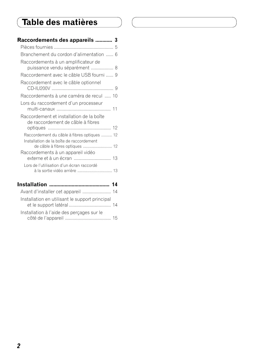 - …. 8 Raccordement avec le câble USB fourni … Raccordement avec le câble ophonnel CD-IU200V . Raccordements à une caméra de recul … 10 Lors du raccordement d'un processeur multi-canaux Raccordement et installation de la boîte de raccordement de cäble à fibres optiques er 12 Raccordement du cäble à fibres optiques 12 Installation de la boîte de raccordement de cäble à fibres optiques 12 Raccordements à un appareil vidéo externe et à un écran …… …. 13 Lors de l'utilisation d'un écran raccordé à la sortie vidéo arrière 13 Installation 14 Avant d'installer cet appareil . 14 Installation en utilisant le support Drinclpal Et 16 SUPpOrÉ latérAl en. 14 Installation à l'aide des perçages s sur le CÔTÉ de l'APPATEÏ 15 p. 9