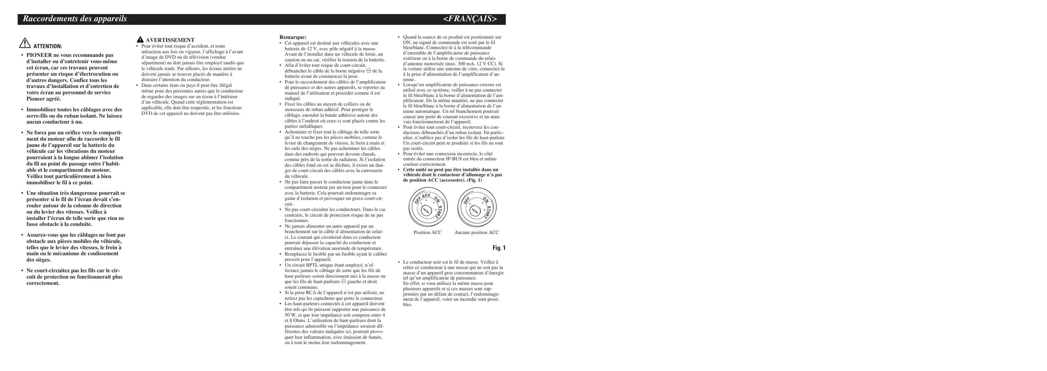 Raccordements des appareils VAN ATTENTION: + PIONEER ne vous recommande pas d'installer ou d’entretenir vous-même cet écran, car ces travaux peuvent présenter un risque d’électrocution ou d’autres dangers. Confiez tous les travaux d'installation et d'entretien de votre écran au personnel de service Pioneer agréé. Immobilisez toutes les câblages avec des serre-fils ou du ruban isolant. Ne laissez aucun conducteur à nu. Ne forez pas un orifice vers le comparti- ment du moteur afin de raccorder le fil jaune de l'appareil sur la batterie du véhicule car les vibrations du moteur pourraient à la longue abîmer l'isolation du fil au point de passage entre l’habit- able et le compartiment du moteur. Veillez tout particulièrement à bien immobiliser Le fil à ce point. Une situation très dangereuse pourrait se présenter si le fil de l'écran devait s’en- rouler autour de la colonne de direction ou du levier des vitesses. Veillez à installer l’écran de telle sorte que rien ne fasse obstacle à la conduite. Assurez-vous que les câblages ne font pas obstacle aux pièces mobiles du véhicule, telles que le levier des vitesses, le frein à main ou le mécanisme de coulissement des sièges. Ne court-cireuitez pas les fils car le cir- cuit de protection ne fonctionnerait plus correctement. À AVERTISSEMENT + Pour éviter tout risque d'accident, et toute infraction aux lois en vigueur, l'affichage à l'avant d'image de DVD ou de télévision (vendue séparément) ne doit jamais être employé tandis que le véhicule roule. Par ailleurs, les écrans arrière ne doivent jamais se trouver placés de manière à distraire l'attention du conducteur. Dans certains états ou pays il peut être illégal même pour des personnes autres que le conducteur de regarder des images sur un écran à l’intérieur d’un véhicule. Quand cette réglementation est applicable, elle doit être respectée, et les fonctions DVD de cet appareil ne doivent pas être utilisées Remarque: Cet appareil est destiné aux véhicules avec une batterie de 12 V, avec pôle négatif à la mass Avant de l'installer dans un véhicule de lois camion ou un car, vérifier la tension de la batterie. Afin d'éviter tout risque de court-circuit, débrancher le câble de la borne négative © de la batterie avant de commencer la pose. Pour le raccordement des câbles de l’amplificateur de puissance et des autres appareils, se reporter au manuel de l’utilisateur et procéder comme il est indiqué. Fixer les câbles au moyen de colliers ou de morceaux de ruban adhésif. Pour protéger le câblage, enrouler la bande adhésive autour des câbles à l'endroit où ceux-ci sont placés contre les parties métalliques. Acheminer et fixer tout le câblage de telle sorte qu'il ne touche pas les pièces mobiles, comme le levier de changement de vitesse, le frein à main et les rails des sièges. Ne pas acheminer les câbles dans des endroits qui peuvent devenir chauds, comme près de la sortie de radiateur. Si l'isolation des câbles fond ou est se déchire, il existe un dan- ger de court-circuit des câbles avec la carrosserie du véhicule. Ne pas faire passer le conducteur jaune dans le compartiment moteur par un trou pour le connecter avec la batterie. Cela pourrait endommager sa gaine d'isolation et provoquer un grave court-cir- cuit. Ne pas court-circuiter les conducteurs. Dans le cas contraire, le circuit de protection risque de ne pas fonctionner. Ne jamais alimenter un autre appareil par un branchement sur le câble d'alimentation de celui- ci. Le courant qui circulerait dans ce conducteur pourrait dépasser la capacité du conducteur et entraîner une élévation anormale de température. Remplacez le fusible par un fusible ayant le calibre prescrit pour l'appareil. Un circuit BPTL unique étant employé, n’ef- fectuez jamais le câblage de sorte que les fils de haut-parleurs soient directement mis à la masse ou que les fils de haut-parleurs © gauche et droit soient communs. Si la prise RCA de l'appareil n’est pas utilisée, ne retirez pas les capuchons que porte le connecteur. Les haut-parleurs connectés à cet appareil doivent être tels qu'ils puissent supporter une puissance de 50 W, et que leur impédance soit comprise entre 4 et 8 Ohms. L'utilisation de haut-parleurs dont la puissance admissible ou l’impédance seraient dif- férentes des valeurs indiquées ici, pourrait provo- quer leur inflammation, avec émission de fumée, ou à tout le moins leur endommagement. <FRANÇAIS> Quand la source de ce produit est positionnée sur ON, un signal de commande est sorti par le fil bleu/blanc. Connectez-le à la télécommande d'ensemble de l’amplificateur de puissance extérieur ou à la borne de commande du relais d'antenne motorisée (max. 300 mA, 12 V CC). Si la voiture utilise une antenne de vitre, connectez-le à la prise d'alimentation de l’amplificateur d’an- tenne. Lorsqu'un amplificateur de puissance externe est utilisé avec ce système, veiller à ne pas connecter le fil bleu/blanc à la borne d'alimentation de l'am- plificateur, De la même manière, ne pas connecter le fil bleu/blanc à la borne d'alimentation de l’an- tenne automatique. Un tel branchement pourrait causer une perte de courant excessive et un mau- vais fonctionnement de l'appareil. Pour éviter tout court-circuit, recouvrez les con- ducteurs débranchés d’un ruban isolant. En partic- ulier, n'oubliez pas d'isoler les fils de haut-parleur. Un court-circuit peut se produire si les fils ne sont pas isolés. Pour éviter une connexion incorrecte, le côté entrée du connecteur IP-BUS est bleu et même couleur correctement. Cette unité ne peut pas être installée dans un véhicule dont le contacteur d'allumage n’a pas de position ACC (accessoire). (Fig. 1) Position ACC Aucune position ACC Fig. 1 Le conducteur noir est le fil de masse. Veillez à relier ce conducteur à une masse qui ne soit pas la masse d’un apparei