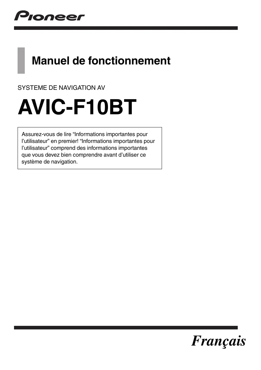 SYSTEME DE NAVIGATION AV AVIC-F10BT Assurez-vous de lire “Informations importantes pour l’utilisateur” en premier! “Informations importantes pour l’utilisateur” comprend des informations importantes que vous devez bien comprendre avant d’utiliser ce système de navigation.