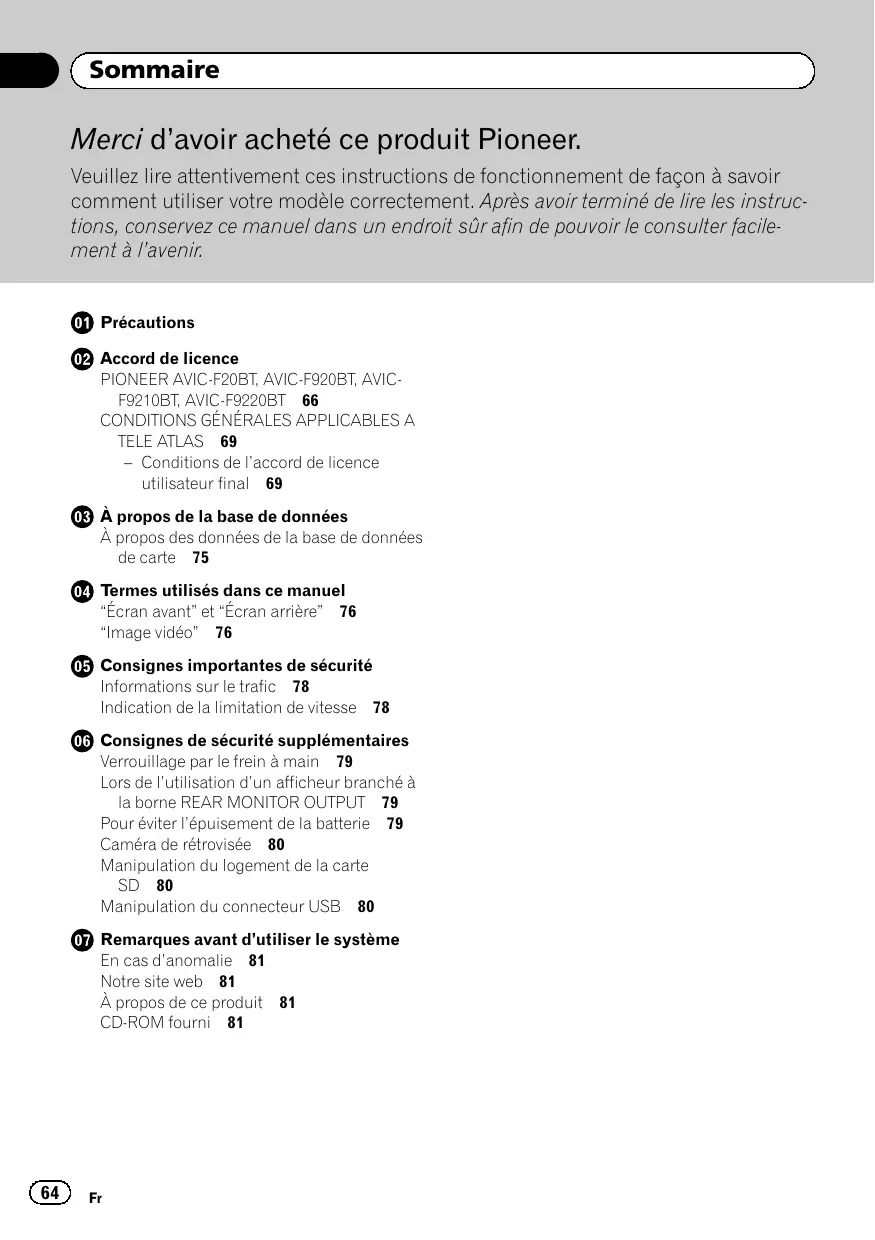 TELEATLAS 69 — Conditions de l'accord de licence utilisateur final 69 @ À propos de la base de données À propos des données de la base de données de carte 15 @® Termes utilisés dans ce manuel Écran avant” et “Écran arrière” 76 Image vidéo” 76 Consignes importantes de sécurité Informations sur le trafic 78 Indication de la limitation de vitesse 78 @ Consignes de sécurité supplémentaires Verrouillage par le frein à main 79 Lors de l'utilisation d'un afficheur branché à la borne REAR MONITOR OUTPUT 79 Pour éviter l'épuisement de la batterie 19 Caméra de rétrovisée 80 Manipulation du logement de la carte SD 80 Manipulation du connecteur USB 80 @® Remarques avant d'utiliser le système En cas d'anomalie 81 Notre site web 81 À propos de ce produit 81 CD-ROM fourni 81 GD #