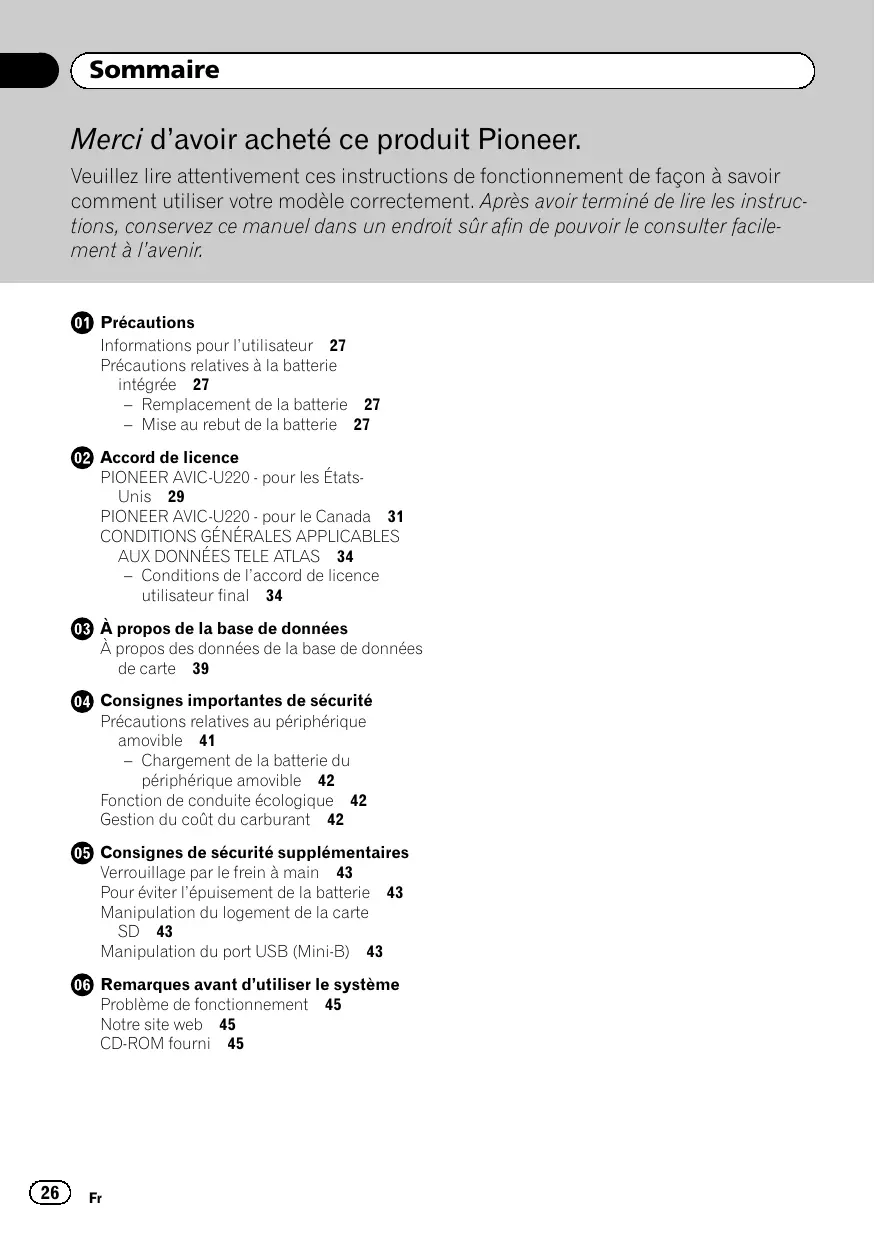 Sommaire Merci d’avoir acheté ce produit Pioneer. Veuillez lire attentivement ces instructions de fonctionnement de façon à savoir comment utiliser votre modèle correctement. Après avoir terminé de lire les instructions, conservez ce manuel dans un endroit sûr afin de pouvoir le consulter facilement à l’avenir. Précautions Informations pour l’utilisateur 27 Précautions relatives à la batterie intégrée 27 – Remplacement de la batterie 27 – Mise au rebut de la batterie 27 Accord de licence PIONEER AVIC-U220 - pour les ÉtatsUnis 29 PIONEER AVIC-U220 - pour le Canada 31