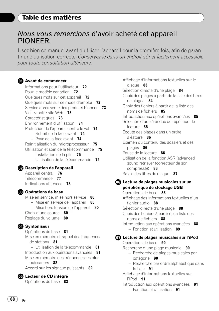 Table des matières Nous vous remercions d’avoir acheté cet appareil PIONEER. Lisez bien ce manuel avant d’utiliser l’appareil pour la première fois, afin de garantir une utilisation correcte. Conservez-le dans un endroit sûr et facilement accessible pour toute consultation ultérieure. Avant de commencer Informations pour l’utilisateur 72 Pour le modèle canadien 72 Quelques mots sur cet appareil 72 Quelques mots sur ce mode d’emploi 72 Service après-vente des produits Pioneer 73 Visitez notre site Web 73 Caractéristiques 73 Environnement d’utilisation 74 Protection de l’appareil contre le vol 74 – Retrait de la face avant 74 – Pose de la face avant 74 Réinitialisation du microprocesseur 75 Utilisation et soin de la télécommande 75 – Installation de la pile 75 – Utilisation de la télécommande 75 Description de l’appareil Appareil central 76 Télécommande 77 Indications affichées 78 Opérations de base Mise en service, mise hors service 80 – Mise en service de l’appareil 80 – Mise hors tension de l’appareil 80 Choix d’une source 80 Réglage du volume 80 Syntoniseur Opérations de base 81 Mise en mémoire et rappel des fréquences de stations 81 – Utilisation de la télécommande 81 Introduction aux opérations avancées 81 Mise en mémoire des fréquences les plus puissantes 82 Accord sur les signaux puissants 82 Lecteur de CD intégré Opérations de base 83