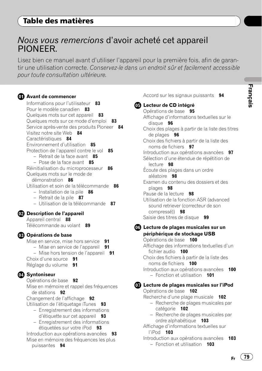 @ Avant de commencer Informations pour l'utilisateur 88 Pour le modèle canadien 83 Quelques mots sur cet appareil 83 Quelques mots sur ce mode d'emploi 83 Service après-vente des produits Pioneer 84 Visitez notre site Web 84 Caractéristiques 84 Environnement d'utilisation 85 Protection de l'appareil contre le vol 85 — Retrait de la face avant 85 — Pose de laface avant 85 Réinitialisation du microprocesseur 86 Quelques mots sur le mode de démonstration 86 Utilisation et soin de la télécommande 86 — Installation de la pile 86 — Retrait de la pile 87 — Utilisation de la télécommande 87