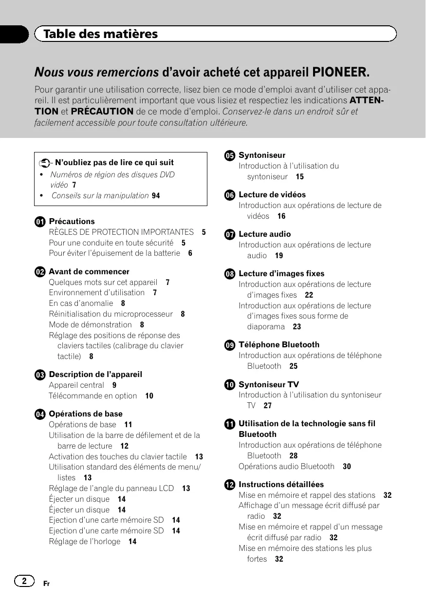 _ À (Table des matières Nous vous remercions d'avoir acheté cet appareil PIONEER. Pour garantir une utilisation correcte, lisez bien ce mode d'emploi avant d'utiliser cet appa- reil. Il est particulièrement important que vous lisiez et respectiez les indications ATTEN- TION et PRÉCAUTION de ce mode d'emploi. Conservez-le dans un endroit sûr et facilement accessible pour toute consultation ultérieure. «- N'oubliez pas de lire ce qui suit + Numéros de région des disques DVD vidéo T + Conseils sur la manipulation 94 @ Précautions