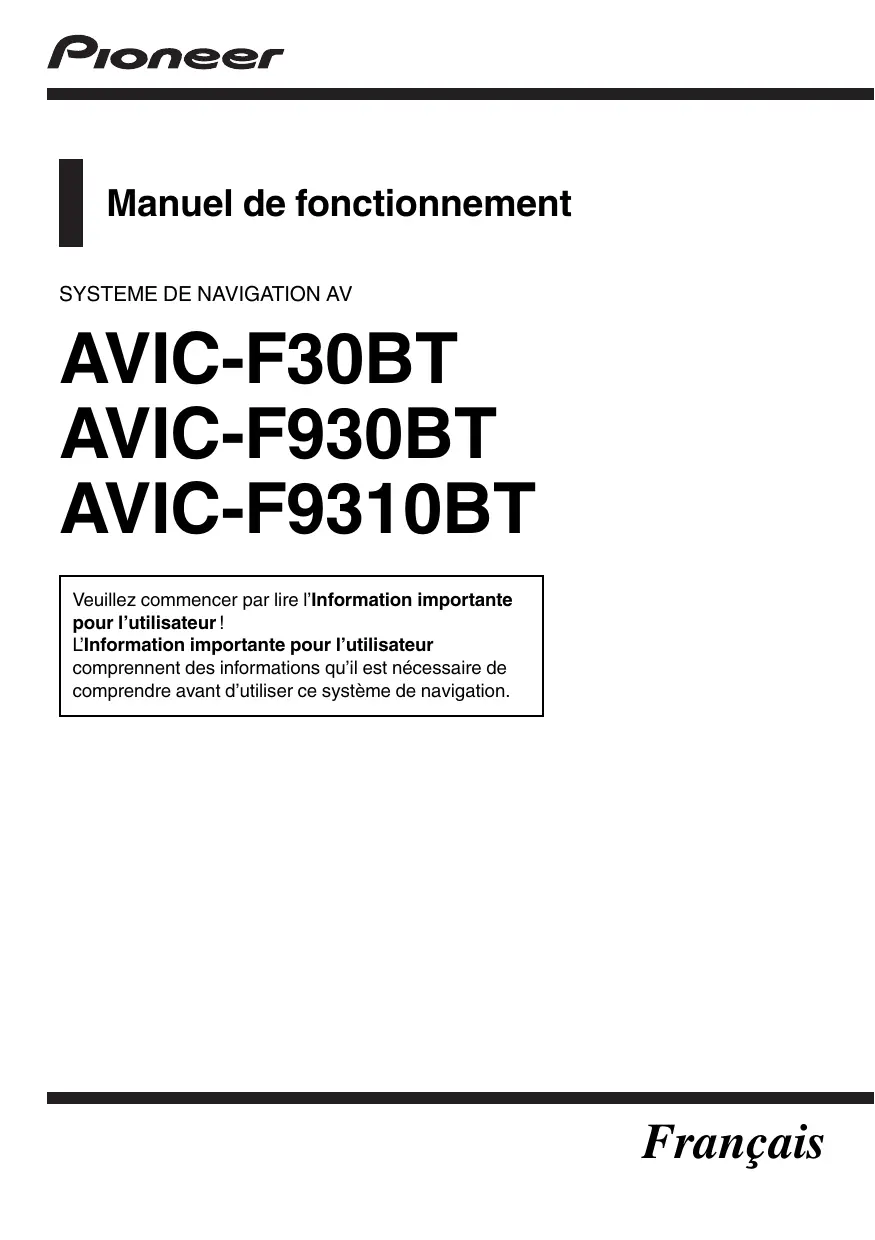 SYSTEME DE NAVIGATION AV AVIC-F30BT AVIC-F930BT AVIC-F9310BT Veuillez commencer par lire l’Information importante pour l’utilisateur ! L’Information importante pour l’utilisateur comprennent des informations qu’il est nécessaire de comprendre avant d’utiliser ce système de navigation.