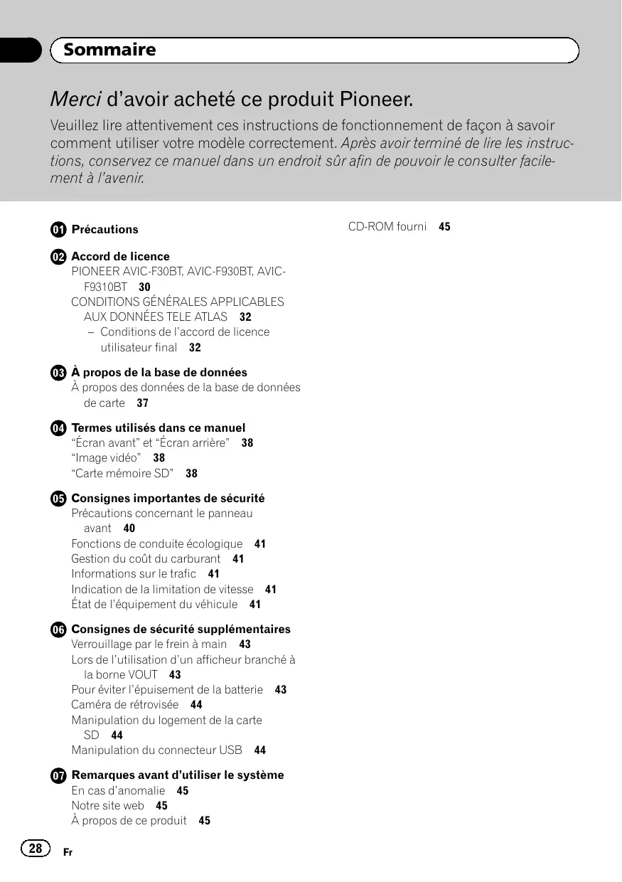 Conditions d'utilisation Les droits d'auteur des données du CD-ROM appartiennent à Pioneer Corporation. Tout transfert non autorisé, copie, diffusion, émis- sion publique, traduction, vente, location ou toute autre action qui dépasse le champ de l'*utilisation personnelle" ou de la “citation” comme défini par la loi sur les droits d'auteur peut être sujet à des actions pénales. L'autori- sation d'utiliser le CD-ROM est donnée sous li- cence de Pioneer Corporation:
