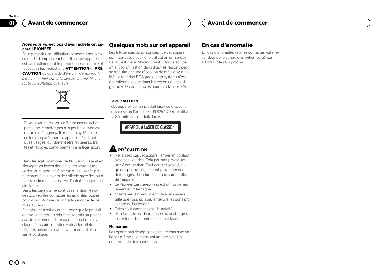 Nous vous remercions d’avoir acheté cet appareil PIONEER. Pour garantir une utilisation correcte, lisez bien ce mode d’emploi avant d’utiliser cet appareil. Il est particulièrement important que vous lisiez et respectiez les indications ATTENTION et PRÉCAUTION de ce mode d’emploi. Conservez-le dans un endroit sûr et facilement accessible pour toute consultation ultérieure. Avant de commencer Quelques mots sur cet appareil En cas d’anomalie Les fréquences du syntoniseur de cet appareil sont attribuées pour une utilisation en Europe de l’Ouest, Asie, Moyen Orient, Afrique et Océanie. Son utilisation dans d’autres régions peut se traduire par une réception de mauvaise qualité. La fonction RDS (radio data system) n’est opérationnelle que dans les régions où des signaux RDS sont diffusés pour les stations FM. En cas d’anomalie, veuillez contacter votre revendeur ou le centre d’entretien agréé par PIONEER le plus proche. PRÉCAUTION Cet appareil est un produit laser de Classe 1, classé selon l’article IEC 60825-1:2007 relatif à la Sécurité des produits laser. Si vous souhaitez vous débarrasser de cet appareil, ne le mettez pas à la poubelle avec vos ordures ménagères. Il existe un système de collecte séparé pour les appareils électroniques usagés, qui doivent être récupérés, traités et recyclés conformément à la législation. Dans les états membres de l’UE, en Suisse et en Norvège, les foyers domestiques peuvent rapporter leurs produits électroniques usagés gratuitement à des points de collecte spécifiés ou à un revendeur (sous réserve d’achat d’un produit similaire). Dans les pays qui ne sont pas mentionnés cidessus, veuillez contacter les autorités locales pour vous informer de la méthode correcte de mise au rebut. En agissant ainsi vous assurerez que le produit que vous mettez au rebut est soumis au processus de traitement, de récupération et de recyclage nécessaire et éviterez ainsi les effets négatifs potentiels sur l’environnement et la santé publique.