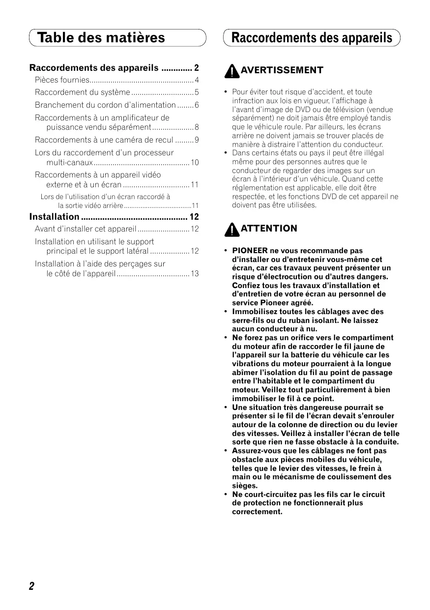 - PIONEER ne vous recommande pas d’installer ou d’entretenir vous-même cet écran, car ces travaux peuvent présenter un risque d’électrocution ou d’autres dangers. Confiez tous les travaux d’installation et d’entretien de votre écran au personnel de service Pioneer agréé.