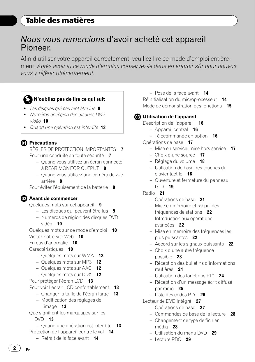 _ à (Table des matières Nous vous remercions d'avoir acheté cet appareil Pioneer. Afin d'utiliser votre appareil correctement, veuillez lire ce mode d'emploi entière- ment. Après avoir lu ce mode d'emploi, conservez-le dans en endroit sûr pour pouvoir vous y référer ultérieurement. M] N'oubliez pas de lire ce qui suit + _Les disques qui peuvent être lus 9 + Numéros de région des disques DVD vidéo 10 + Quand une opération est interdite 18 @ Précautions