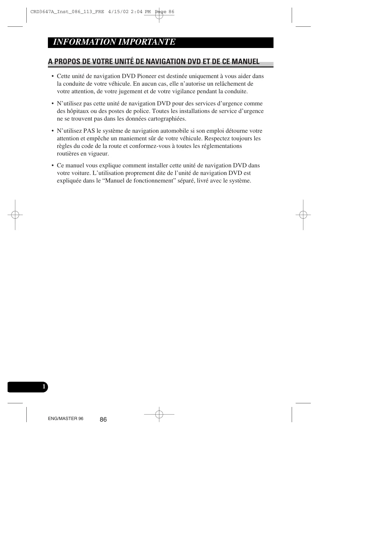 INFORMATION IMPORTANTE A PROPOS DE VOTRE UNITÉ DE NAVIGATION DVD ET DE CE MANUEL