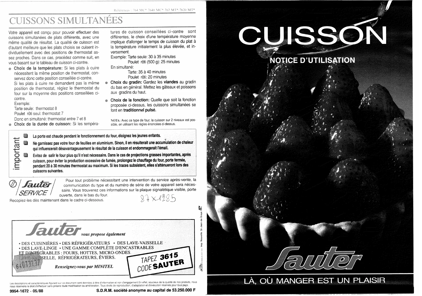 7640MC1 - Four cuisson simultanée SAUTER - Notice d'utilisation et mode d'emploi gratuit