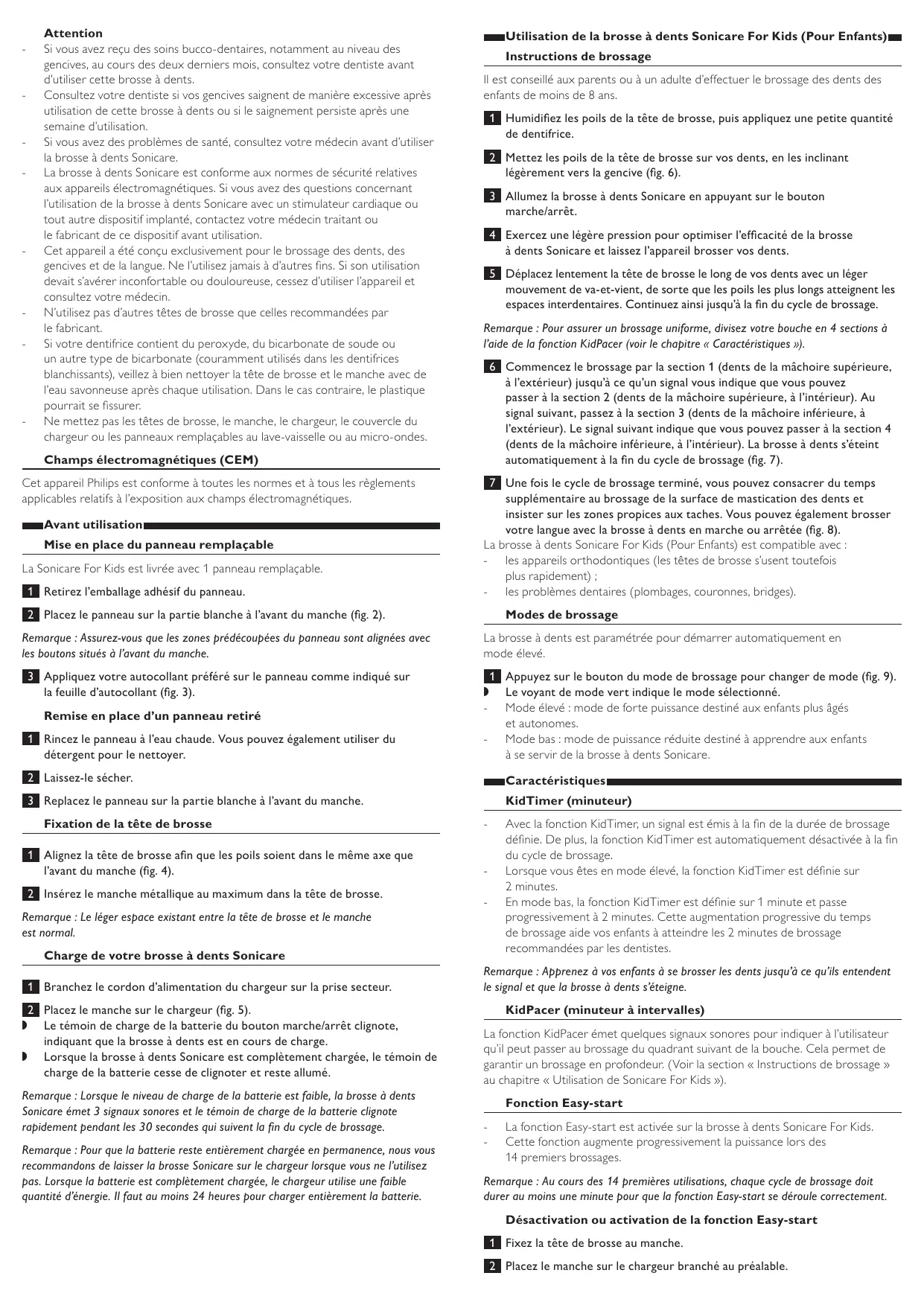 Attention Si vous avez reçu des soins bucco-dentaires, notamment au niveau des gencives, au cours des deux derniers mois, consultez votre dentiste avant d’utiliser cette brosse à dents. Consultez votre dentiste si vos gencives saignent de manière excessive après utilisation de cette brosse à dents ou si le saignement persiste après une semaine d’utilisation. Si vous avez des problèmes de santé, consultez votre médecin avant d’utiliser la brosse à dents Sonicare. La brosse à dents Sonicare est conforme aux normes de sécurité relatives aux appareils électromagnétiques. Si vous avez des questions concernant l’utilisation de la brosse à dents Sonicare avec un stimulateur cardiaque ou tout autre dispositif implanté, contactez votre médecin traitant ou le fabricant de ce dispositif avant utilisation. Cet appareil a été conçu exclusivement pour le brossage des dents, des gencives et de la langue. Ne l’utilisez jamais à d’autres fins. Si son utilisation devait s’avérer inconfortable ou douloureuse, cessez d’utiliser l’appareil et consultez votre médecin. N’utilisez pas d’autres têtes de brosse que celles recommandées par le fabricant. Si votre dentifrice contient du peroxyde, du bicarbonate de soude ou un autre type de bicarbonate (couramment utilisés dans les dentifrices blanchissants), veillez à bien nettoyer la tête de brosse et le manche avec de l’eau savonneuse après chaque utilisation. Dans le cas contraire, le plastique pourrait se fissurer. Ne mettez pas les têtes de brosse, le manche, le chargeur, le couvercle du chargeur ou les panneaux remplaçables au lave-vaisselle ou au micro-ondes. Champs électromagnétiques (CEM) Cet appareil Philips est conforme à toutes les normes et à tous les règlements applicables relatifs à l’exposition aux champs électromagnétiques. Avant utilisation Mise en place du panneau remplaçable La Sonicare For Kids est livrée avec 1 panneau remplaçable. 1 Retirez l’emballage adhésif du panneau. Utilisation de la brosse à dents Sonicare For Kids (Pour Enfants) Instructions de brossage Il est conseillé aux parents ou à un adulte d’effectuer le brossage des dents des enfants de moins de 8 ans. 1 Humidifiez les poils de la tête de brosse, puis appliquez une petite quantité de dentifrice. 2 Mettez les poils de la tête de brosse sur vos dents, en les inclinant légèrement vers la gencive (fig. 6). 3 Allumez la brosse à dents Sonicare en appuyant sur le bouton marche/arrêt. 4 Exercez une légère pression pour optimiser l’efficacité de la brosse à dents Sonicare et laissez l’appareil brosser vos dents. 5 Déplacez lentement la tête de brosse le long de vos dents avec un léger mouvement de va-et-vient, de sorte que les poils les plus longs atteignent les espaces interdentaires. Continuez ainsi jusqu’à la fin du cycle de brossage. Remarque : Pour assurer un brossage uniforme, divisez votre bouche en 4 sections à l’aide de la fonction KidPacer (voir le chapitre « Caractéristiques »). 6 Commencez le brossage par la section 1 (dents de la mâchoire supérieure, à l’extérieur) jusqu’à ce qu’un signal vous indique que vous pouvez passer à la section 2 (dents de la mâchoire supérieure, à l’intérieur). Au signal suivant, passez à la section 3 (dents de la mâchoire inférieure, à l’extérieur). Le signal suivant indique que vous pouvez passer à la section 4 (dents de la mâchoire inférieure, à l’intérieur). La brosse à dents s’éteint automatiquement à la fin du cycle de brossage (fig. 7). 7 Une fois le cycle de brossage terminé, vous pouvez consacrer du temps supplémentaire au brossage de la surface de mastication des dents et insister sur les zones propices aux taches. Vous pouvez également brosser votre langue avec la brosse à dents en marche ou arrêtée (fig. 8). La brosse à dents Sonicare For Kids (Pour Enfants) est compatible avec : -- les appareils orthodontiques (les têtes de brosse s’usent toutefois plus rapidement) ; -- les problèmes dentaires (plombages, couronnes, bridges). 2 Placez le panneau sur la partie blanche à l’avant du manche (fig. 2). Remarque : Assurez-vous que les zones prédécoupées du panneau sont alignées avec les boutons situés à l’avant du manche. 3 Appliquez votre autocollant préféré sur le panneau comme indiqué sur la feuille d’autocollant (fig. 3). Remise en place d’un panneau retiré 1 Rincez le panneau à l’eau chaude. Vous pouvez également utiliser du détergent pour le nettoyer. Modes de brossage La brosse à dents est paramétrée pour démarrer automatiquement en mode élevé. 1 Appuyez sur le bouton du mode de brossage pour changer de mode (fig. 9). ,, Le voyant de mode vert indique le mode sélectionné. -- Mode élevé : mode de forte puissance destiné aux enfants plus âgés et autonomes. -- Mode bas : mode de puissance réduite destiné à apprendre aux enfants à se servir de la brosse à dents Sonicare. 2 Laissez-le sécher. Caractéristiques 3 Replacez le panneau sur la partie blanche à l’avant du manche. KidTimer (minuteur) Fixation de la tête de brosse 1 Alignez la tête de brosse afin que les poils soient dans le même axe que l’avant du manche (fig. 4). 2 Insérez le manche métallique au maximum dans la tête de brosse. Remarque : Le léger espace existant entre la tête de brosse et le manche est normal. Charge de votre brosse à dents Sonicare 1 Branchez le cordon d’alimentation du chargeur sur la prise secteur. 2 Placez le manche sur le chargeur (fig. 5). ,, Le témoin de charge de la batterie du bouton marche/arrêt clignote, indiquant que la brosse à dents est en cours de charge. ,, Lorsque la brosse à dents Sonicare est complètement chargée, le témoin de charge de la batterie cesse de clignoter et reste allumé. Remarque : Lorsque le niveau de charge de la batterie est faible, la brosse à dents Sonicare émet 3 signaux sonores et le témoin de charge de