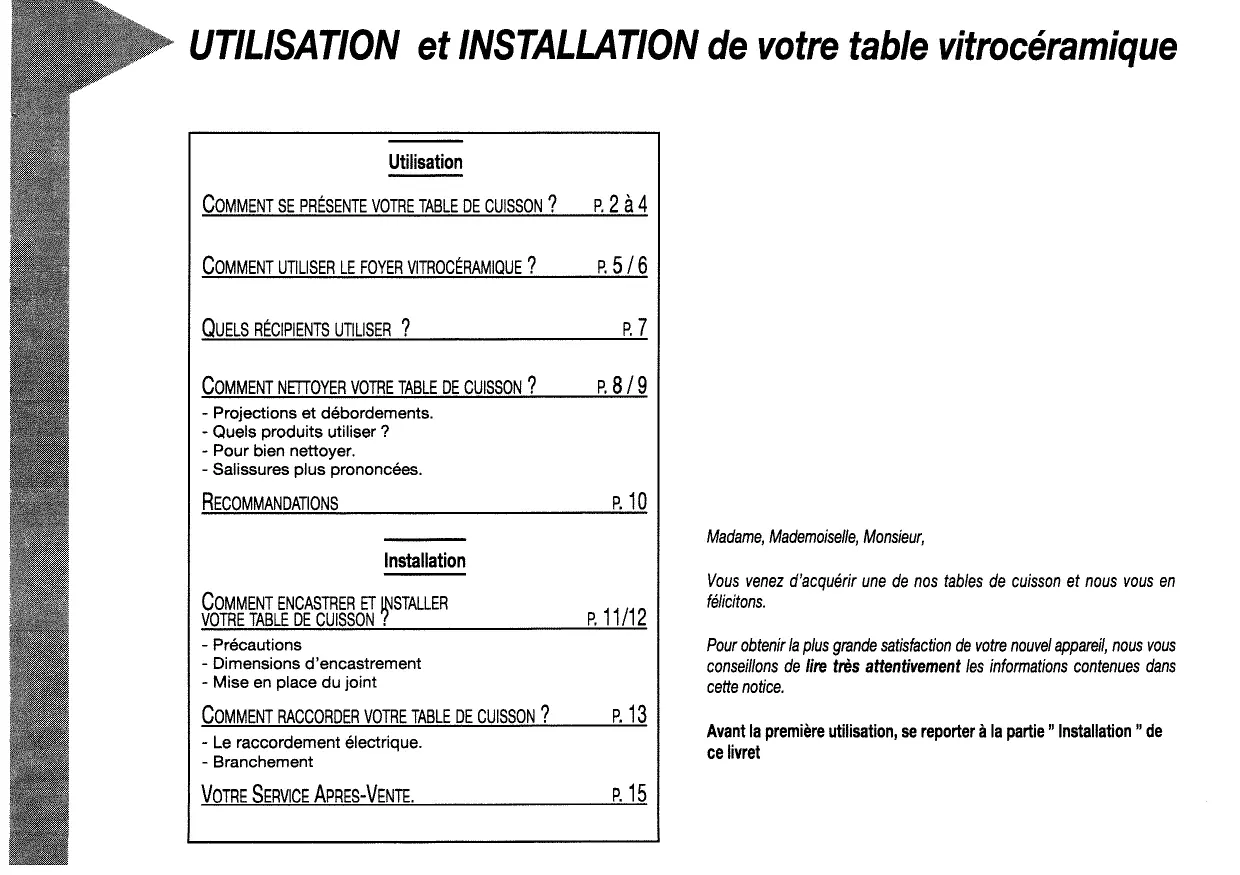 UTILISATION et INSTALLATION de votre table vitrocéramique