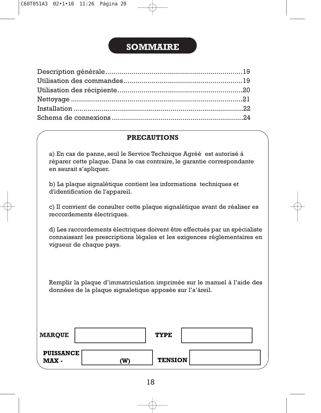 - Schema de connexions PRECAUTIONS a) En cas de panne, seul le Service Technique Agréé est autorisé à réparer cette plaque. Dans le cas contraire, le garantie correspondante en saurait s’apliquer. b) La plaque signalétique contient les informations techniques et d'identification de l'appareil. c) Il convient de consulter cette plaque signalétique avant de réaliser es reccordements électriques. d) Les raccordements électriques doivent être effectués par un spécialiste connaissant les prescriptions légales et les exigences réglementaires en vigueur de chaque pays. Remplir la plaque d’immatriculation imprimée sur le manuel à l’aide des données de la plaque signaletique apposée sur l’a’áreil. MARQUE PUISSANCE MAX - TYPE TENSION (W) p. 24