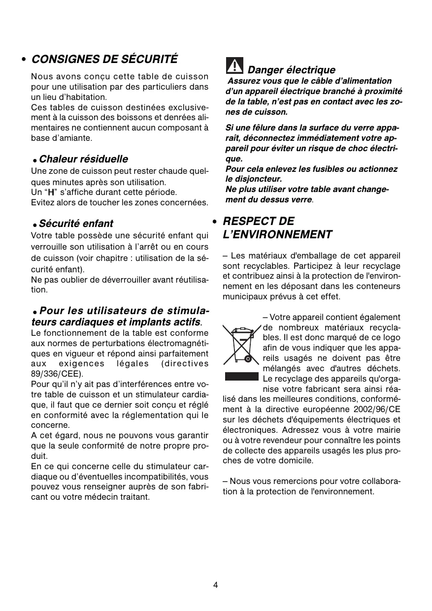 - Pour les utilisateurs de stimulateurs cardiaques et implants actifs. — Votre appareil contient également de nombreux matériaux recyclables. Il est donc marqué de ce logo afin de vous indiquer que les appareils usagés ne doivent pas être mélangés avec d'autres déchets. Le recyclage des appareils qu'organise votre fabricant sera ainsi réalisé dans les meilleures conditions, conformément à la directive européenne 2002/96/CE sur les déchets d'équipements électriques et électroniques. Adressez vous à votre mairie ou à votre revendeur pour connaître les points de collecte des appareils usagés les plus proches de votre domicile. Le fonctionnement de la table est conforme aux normes de perturbations électromagnétiques en vigueur et répond ainsi parfaitement aux exigences légales (directives 89/336/CEE). Pour qu’il n’y ait pas d’interférences entre votre table de cuisson et un stimulateur cardiaque, il faut que ce dernier soit conçu et réglé en conformité avec la réglementation qui le concerne. A cet égard, nous ne pouvons vous garantir que la seule conformité de notre propre produit. En ce qui concerne celle du stimulateur cardiaque ou d’éventuelles incompatibilités, vous pouvez vous renseigner auprès de son fabricant ou votre médecin traitant. — Nous vous remercions pour votre collaboration à la protection de l'environnement.